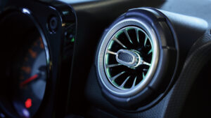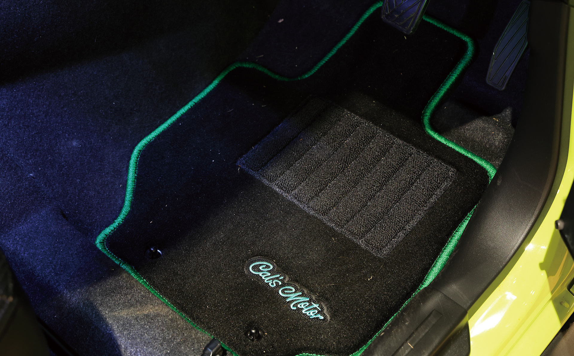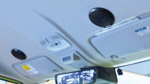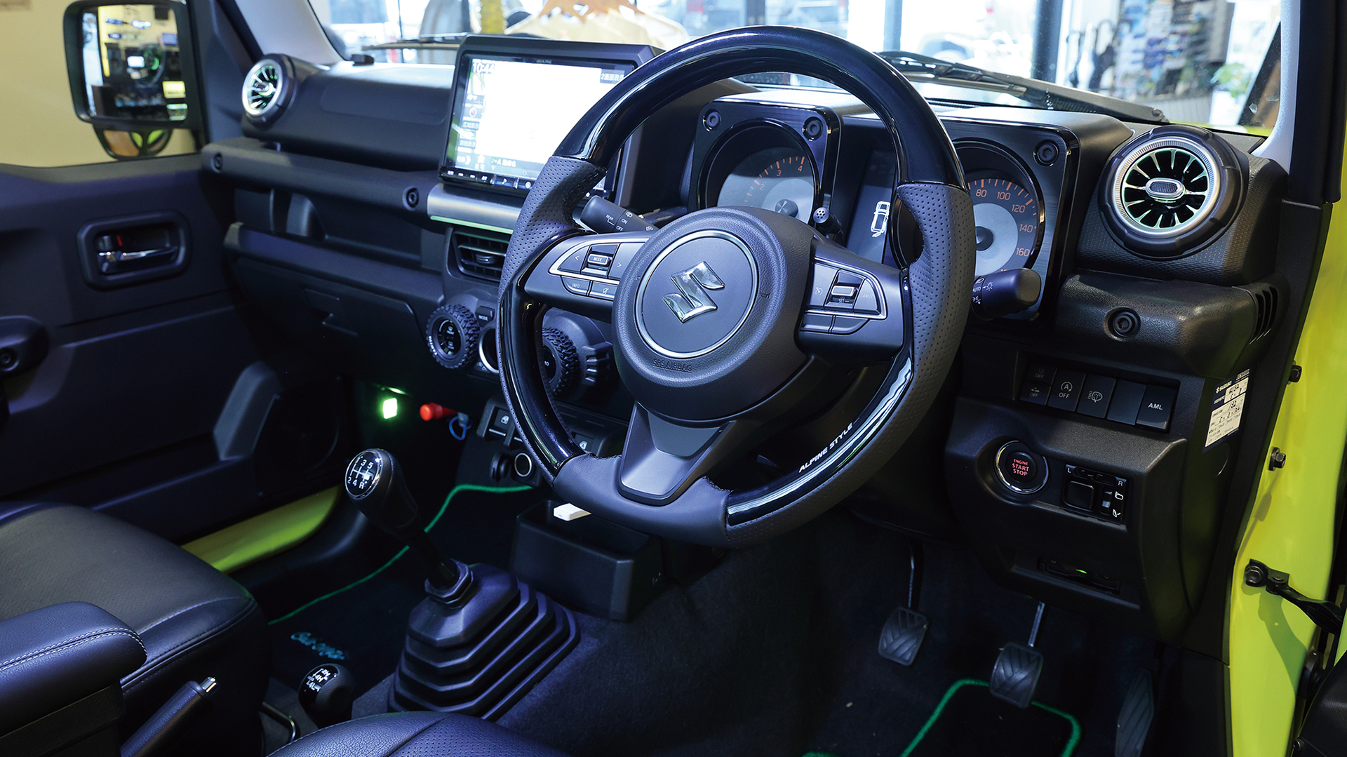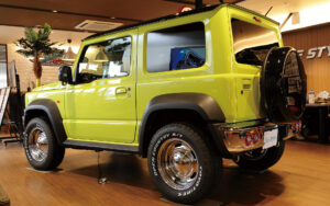 パーフェクトフィットによる専用パネルにて装着されたカーナビゲーション「BIG X」や天井から音が降り注ぐ「メティオサウンド」をインストールしたジムニーJB64。専用のオープニング画面、そしてジムニー専用チューニングサウンドに加え、オリジナルフロアマットやイルミネーションでオーナーならずとも心が震えるほどの感動体験が味わえる仕様となっているインテリア。