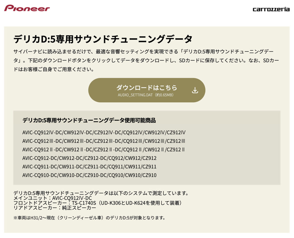 HPでは、サイバーナビに読み込ませるだけで、最適な音響セッティングを実現する「デリカD:5専用サウンドチューニングデータ」を配信している。