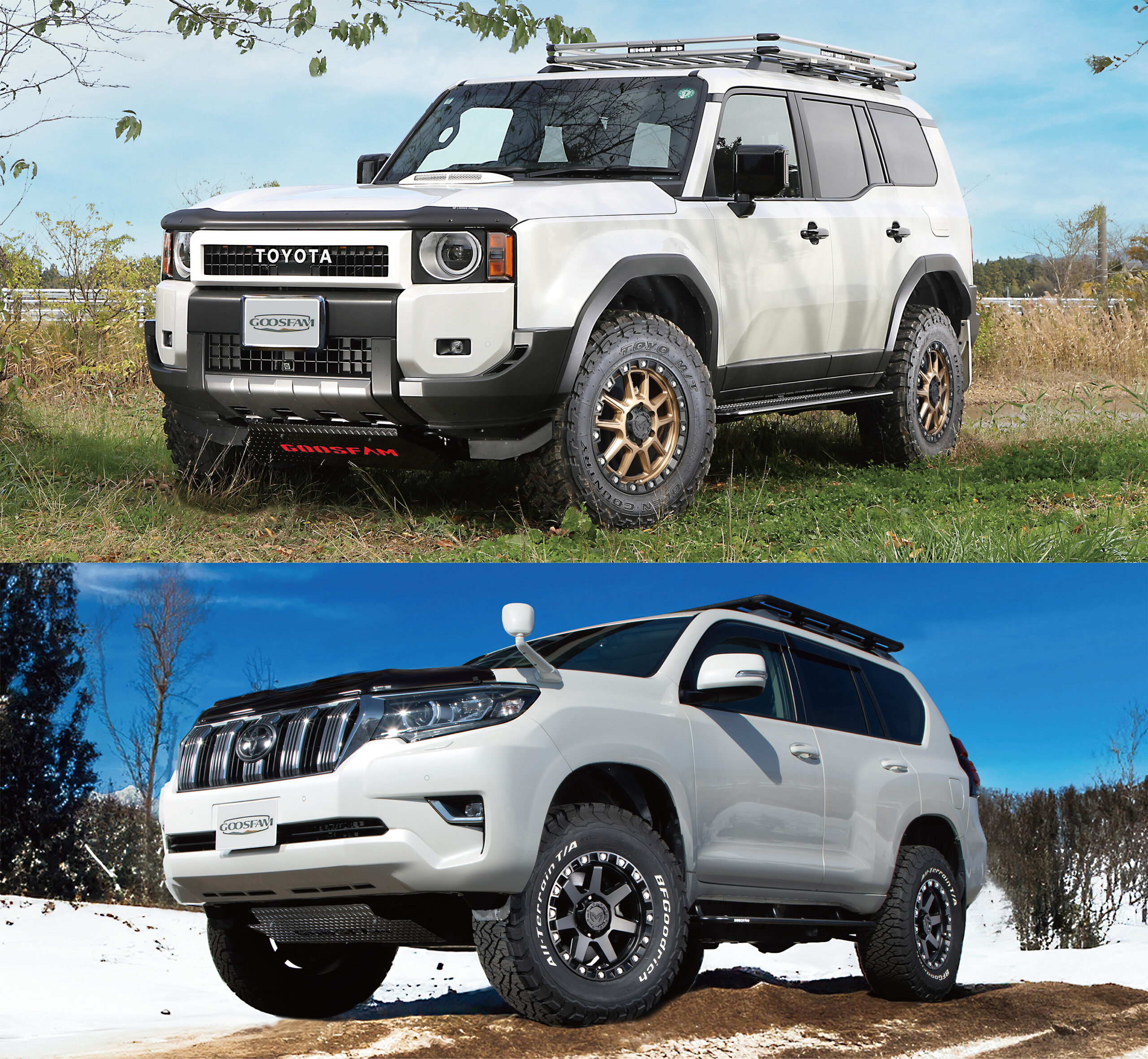 GOOSFAMパーツとしては、ランドクルーザー250用、150プラド用、ハイラックス用、デリカD:5用、ジムニー・ジムニーシエラ用をラインナップ。ランドクルーザー250と150プラド、ハイラックスには、オリジナルのスキッドプレート(ブラック、レッド、ホワイト)、サイドステップを用意し、さらにランクル250用に1インチアップとなるオリジナルコイルスプリングをリリース。また、MKWホイールのM203(コヨーテブロンズとブラックキャット)とM205(ドライグレー)に、GOOSFAM専売カラーを用意し、ジムニー・ジムニーシエラは、オリジナルデザイン&カラーとなるサイドデカール、シートカバーをラインナップしている。SANO AUTOの向いに、カスタムショップとなるGOOSFAM(グースファム)がスタート。より幅広いカスタム&パーツ販売を可能にしている。