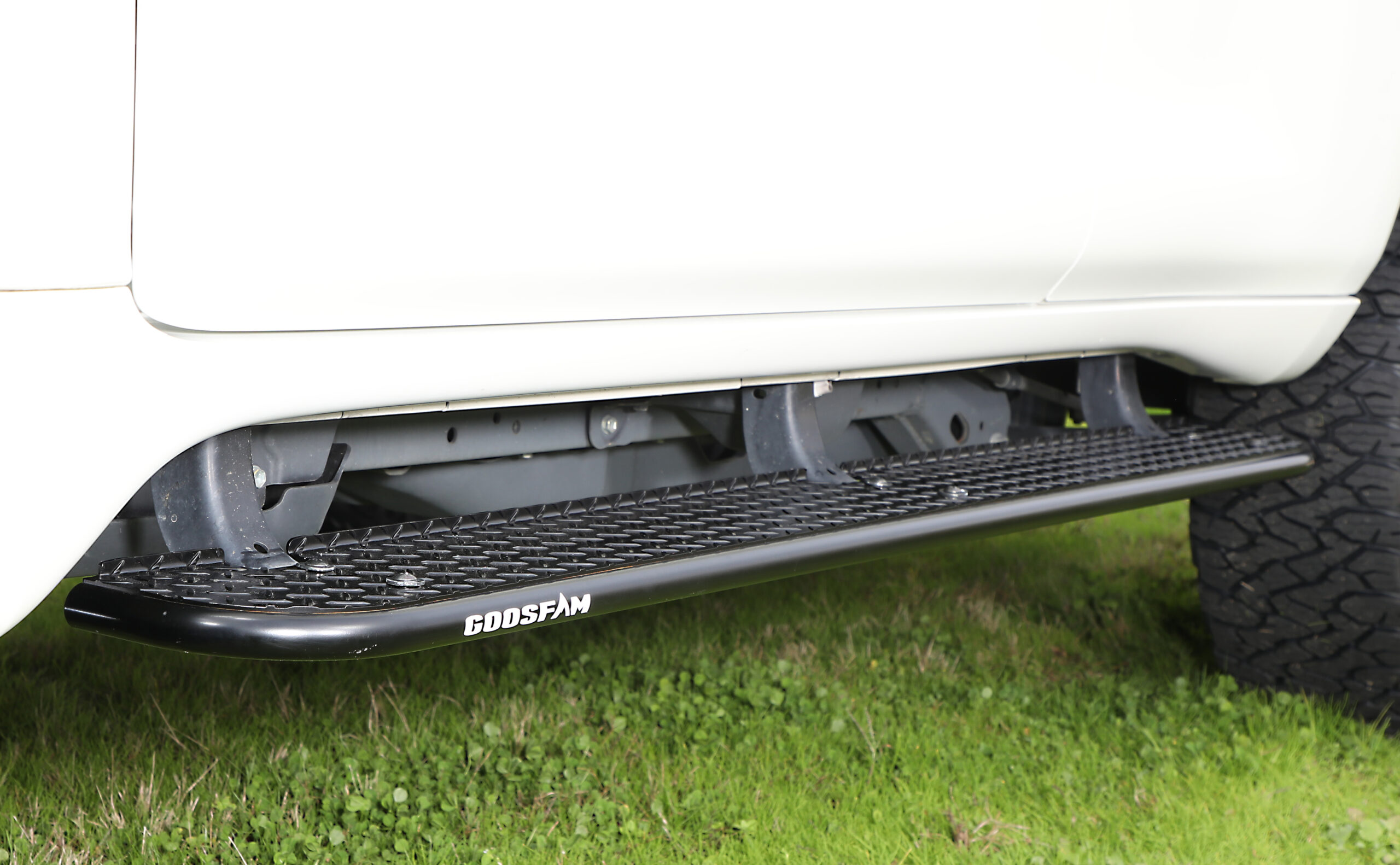 日常からアクティブシーンまで幅広く活躍できるデザインで、取り付けは純正サイドステップのカバーを外して載せて固定するだけ。対応車種はランドクルーザー250、150プラド、ハイラックス。価格はランドクルーザー250/70,000円、150プラド/46,700円、ハイラックス/61,900円(すべて税込/送料別)。GOOSFAMオリジナルスキッドプレートは、BLACK×RED、WHITE×RED、REDの3色からお好みに合わせてセレクトできる。素材には高強度スチール製縞板鋼板を用いて下回りをがっちりガードし、GOOSFAMのロゴがアクセントとなっている。取り付けは加工なし。価格は各色63,400円(税込)。対応車種はランドクルーザー250、150プラド、ハイラックスとなっている。