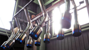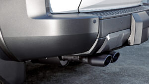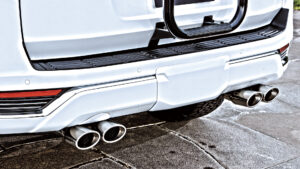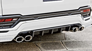 上記、片側2本出しマフラーより、リアビューでの存在感を主張できるのが迫力満点のスプリット4本出しマフラー。この4本出しも2本出しと同様に、スクエアとオーバルの2種類からテールエンド形状をチョイス可能。見た目にもアグレッシブなレイアウトだが、左右にフィニッシャーを配置することで排気効率も高められているのもポイント。ノーマルとは明らかに異なる存在感やスポーティな走りが楽しめるようになるのは大きなメリットとなるだろう。