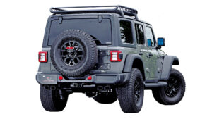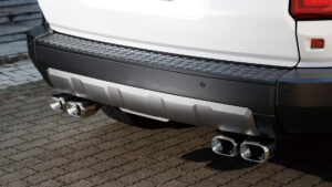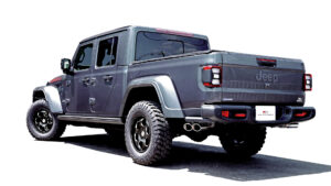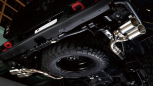 ランクル250用として今回注目したいのが、ノーマルに準拠した助手席側にレイアウトされた左2本出し『スプリットデュアルマフラー』。このマフラーはメインサイレンサーを縦向きにしているが、これはスペアタイヤを残せる配慮によるもの。またサイレンサーには車検対応の証であるJQRプレートを貼付けてある。また左写真で装着された『タイプW』は113㎜×85㎜のオーバル形状のテールエンドを2×2でセットして、存在感をしっかりと主張。