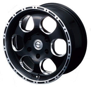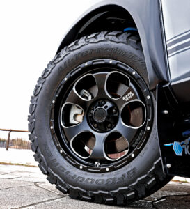 シャープさが際立つショートスポーク、フローフォーミングだから実現できた拡大された異形楕円の丸穴、そのエッジを削ることで煌びやかな印象をあたえるミーリング加工、肉抜き部分が多いからこそ、当然軽さも実現。一方でオフロードホイールの王道である〝レンコンホイール〟であるため、しっかりとワイルドで重厚感があるのも特徴だ。サイズは18×8.0J+10/5H-114.3で、デリカD:5やエクストレイルでオーバーフェンダー装着を前提としたカスタムサイズ。より深いリムを表現できるマイナスインセットによって、コンケーブ形状もより際立つ。見た目のみのホイールではなく、先述の通りフローフォーミング製法の採用のほか、特許取得済みの独自の技術であるアンチエアリークも採用。これはスローパンクチャーやオフロード走行などでタイヤが変形した場合に起こるビートアイシング現象、さらに万が一リムを破損した場合でも、タイヤ内の空気がタイヤとホイールの勘合部より漏れるのを防ぐことができる特殊機構なのだ。