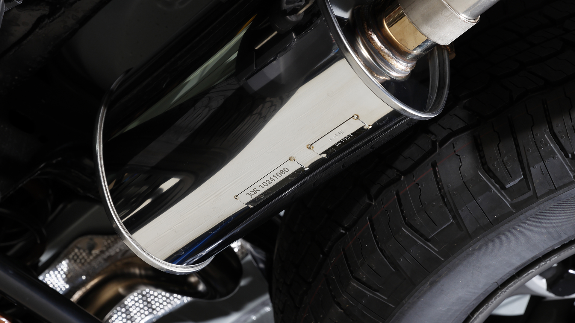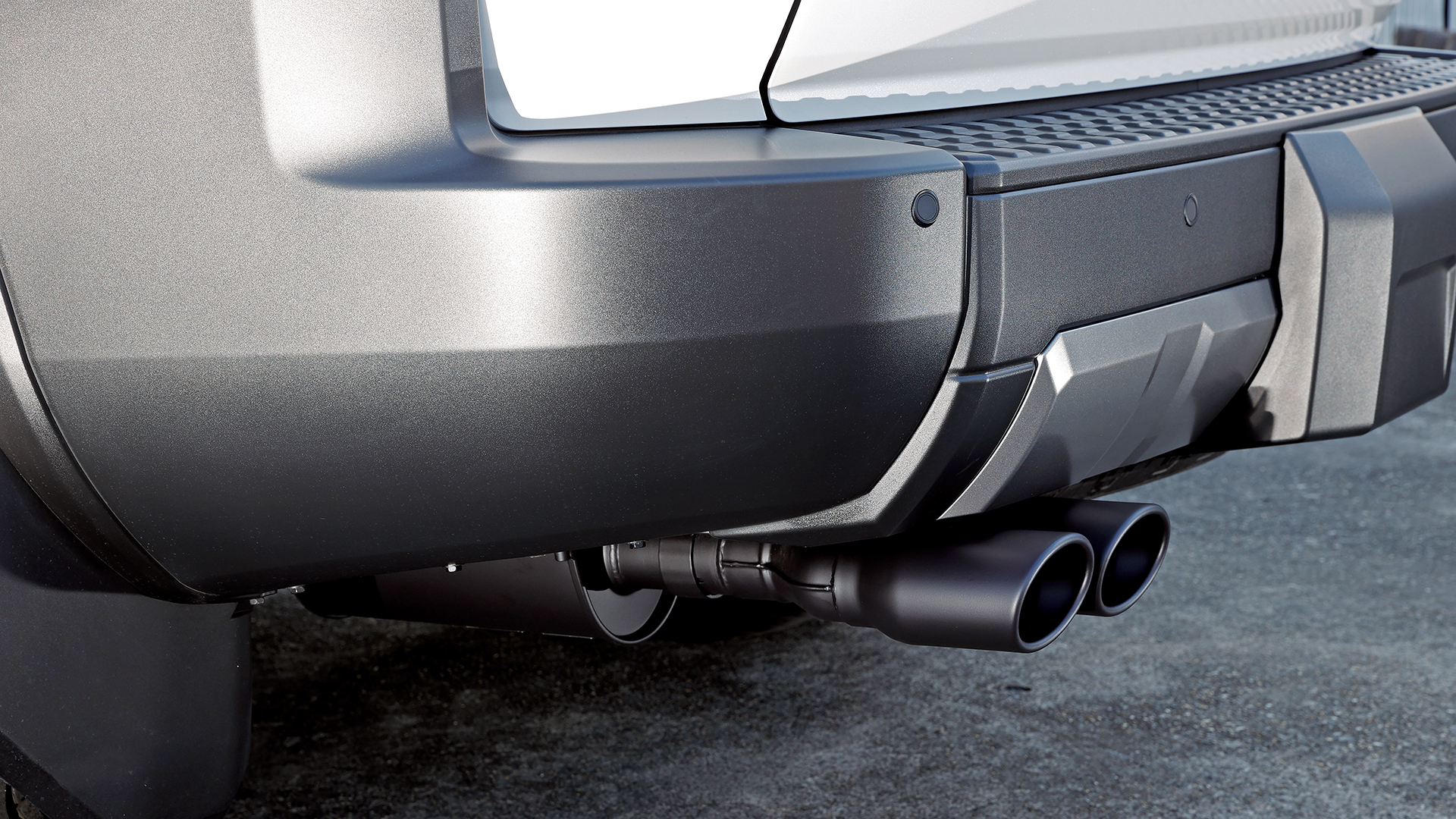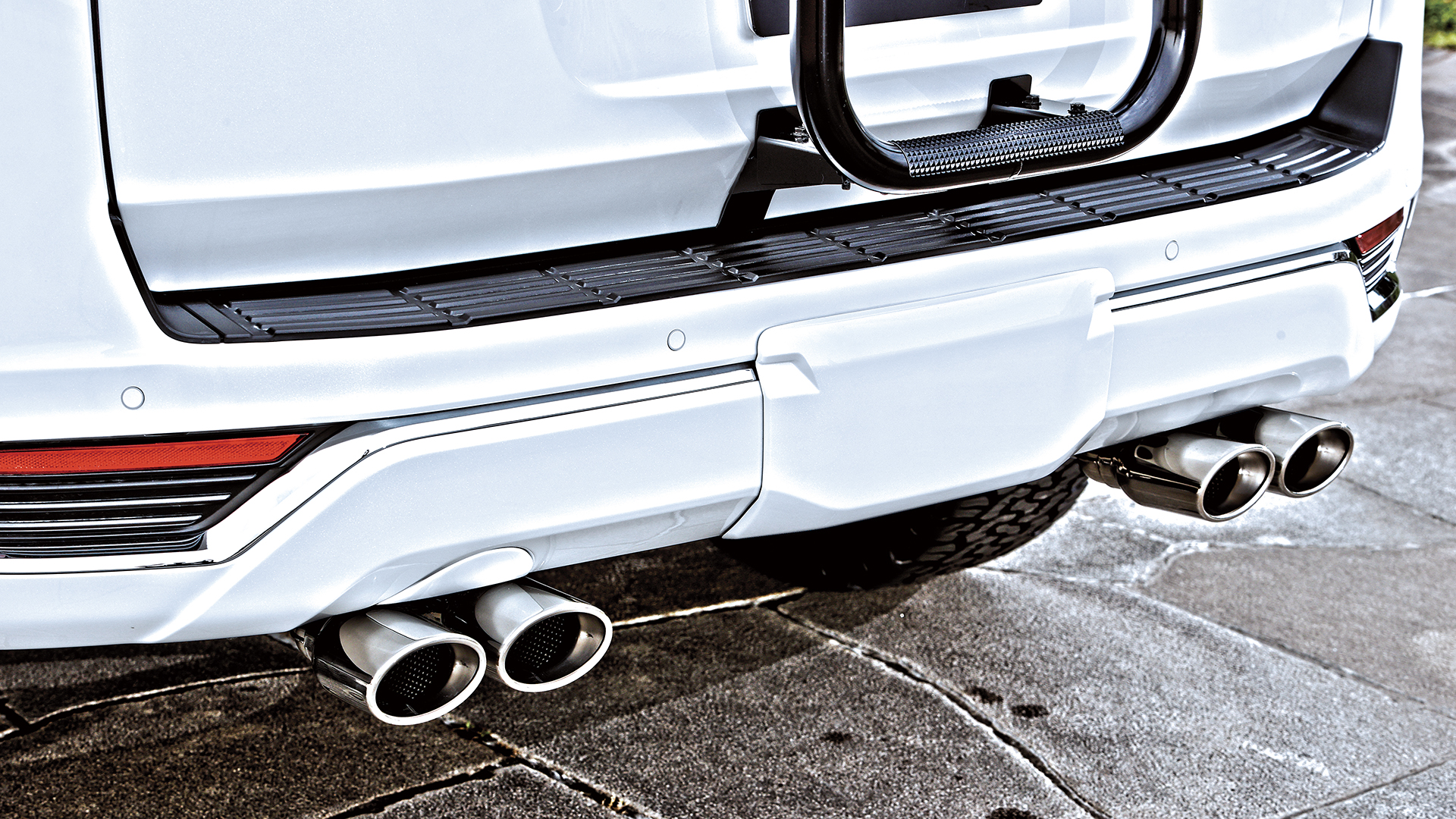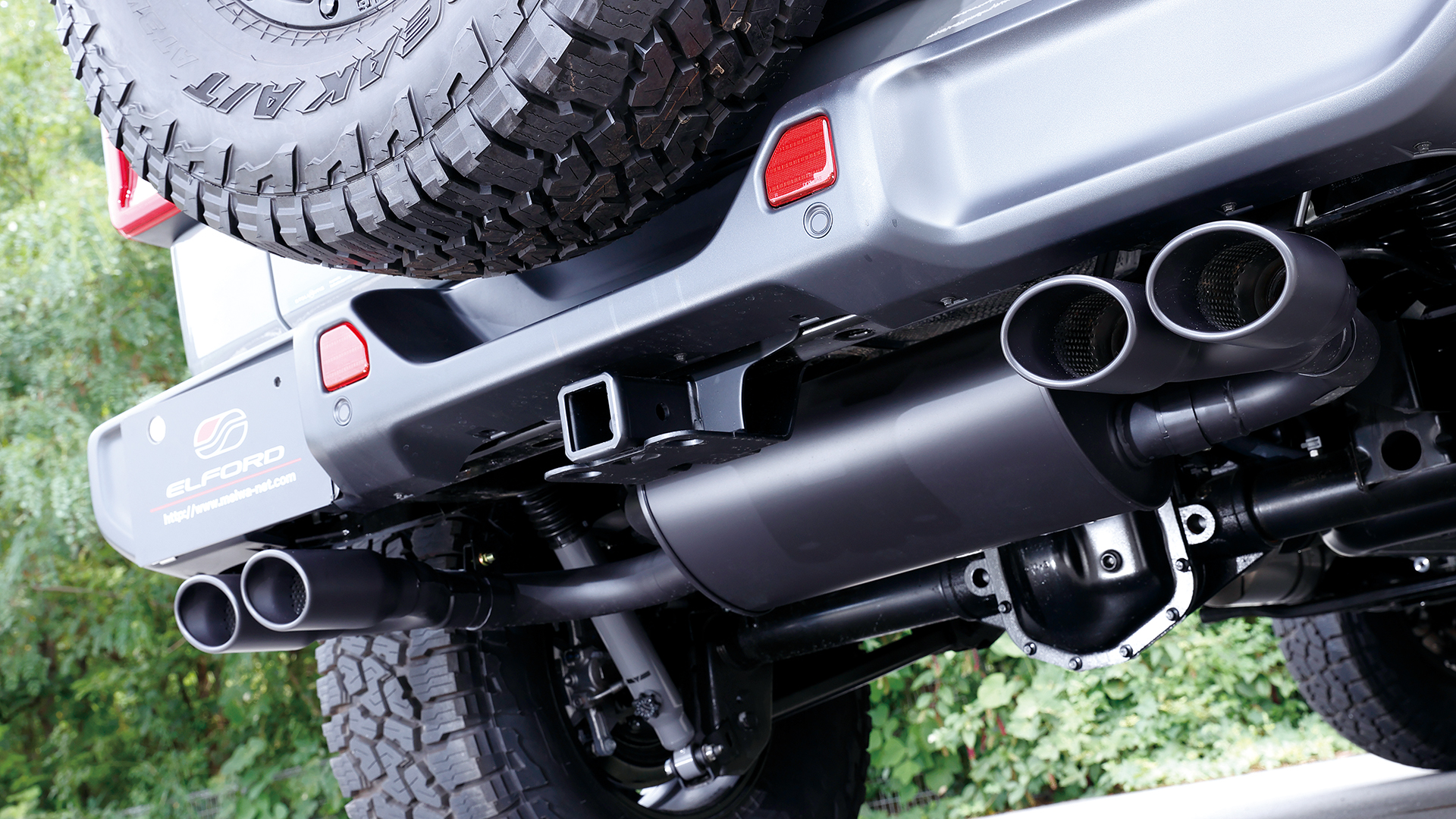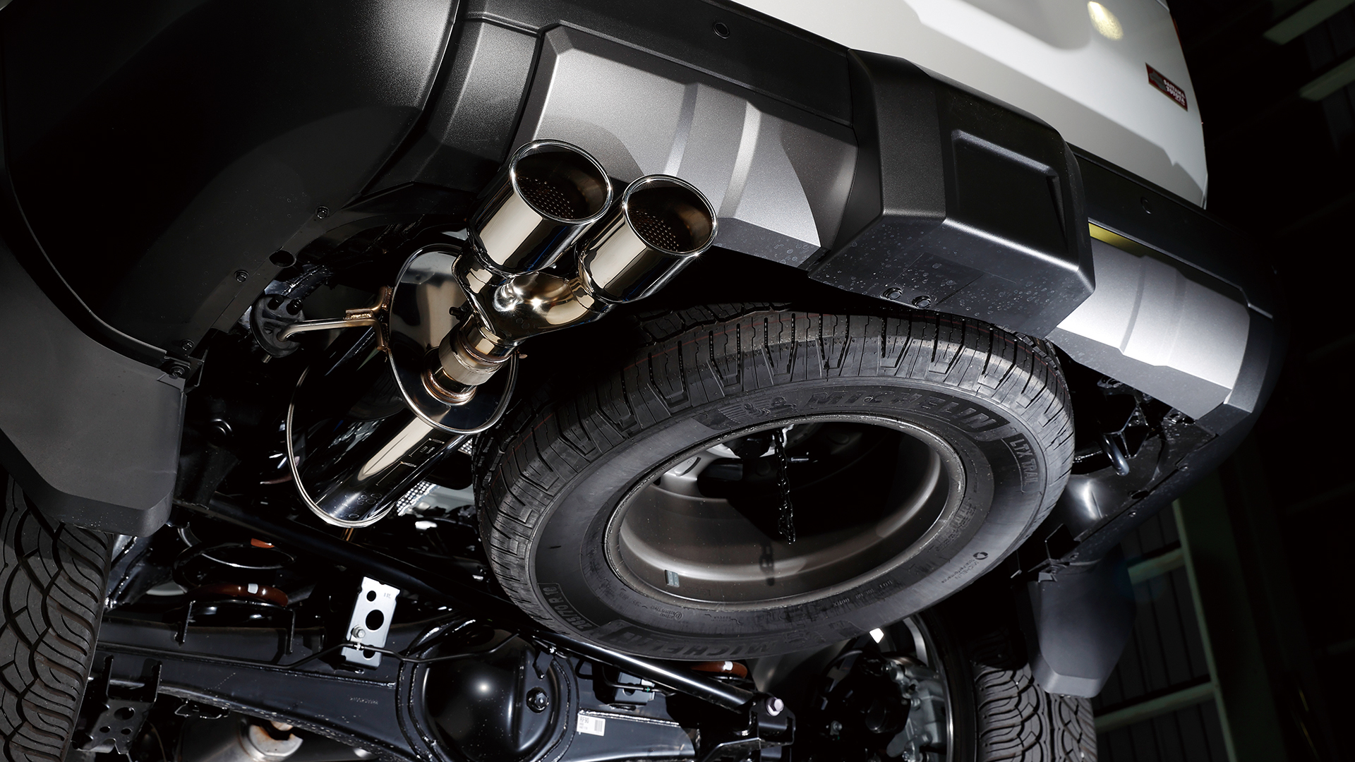 ランクル250用として今回注目したいのが、ノーマルに準拠した助手席側にレイアウトされた左2本出し『スプリットデュアルマフラー』。このマフラーはメインサイレンサーを縦向きにしているが、これはスペアタイヤを残せる配慮によるもの。またサイレンサーには車検対応の証であるJQRプレートを貼付けてある。また左写真で装着された『タイプW』は113㎜×85㎜のオーバル形状のテールエンドを2×2でセットして、存在感をしっかりと主張。