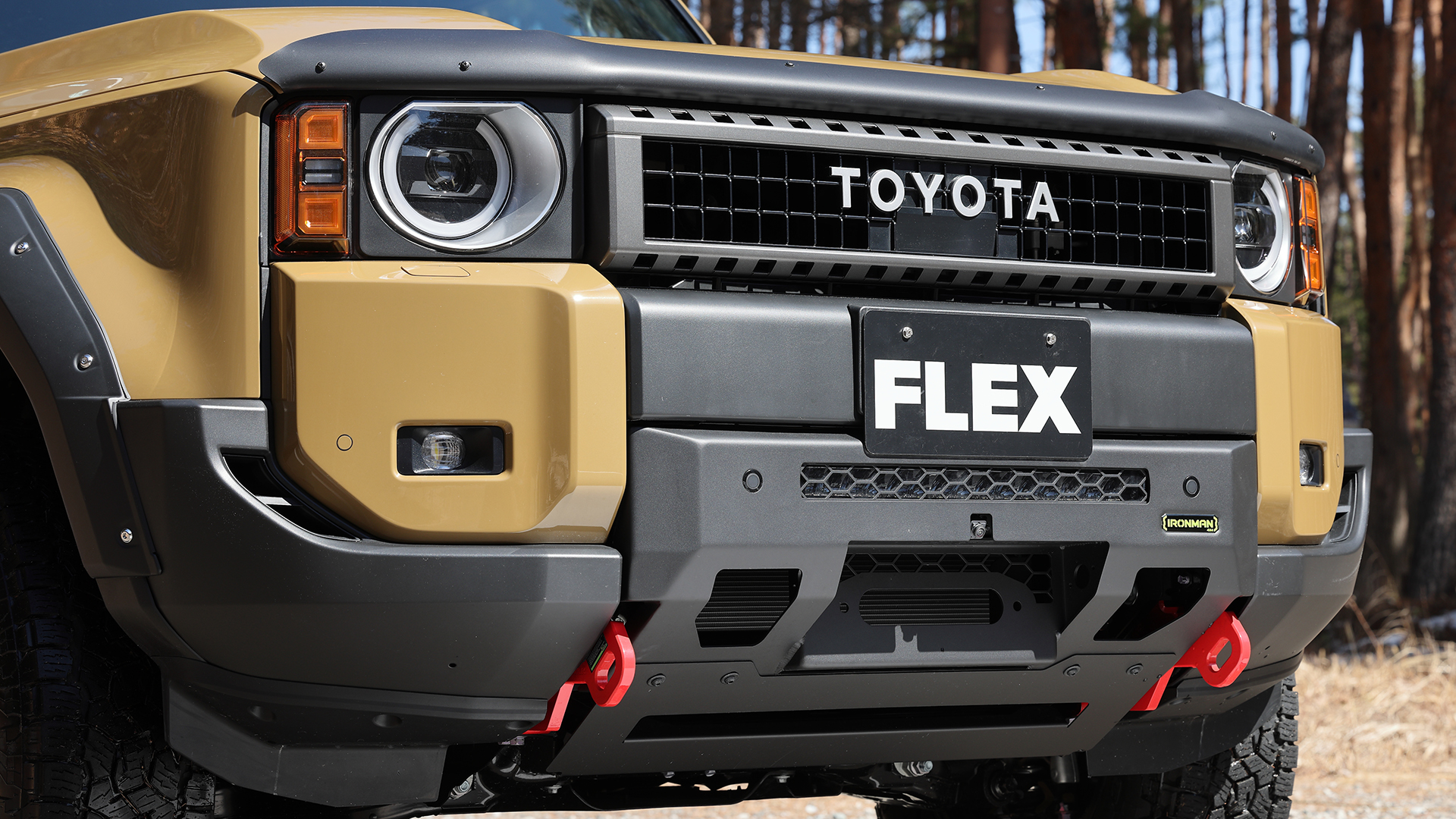 今回のFLEX250カスタムの最大のポイントは今後FLEX CUSTOMとして本格的に導入されるアイアンマン 4×4製パーツをセンス良く選びランクル250に装備したこと。特にポイントとなるのが、フロントバンパーに追加されているバンパーガーニッシュを装着。ノーマルのフェイスを崩さずにちょいゴツめのタフさをアピール。