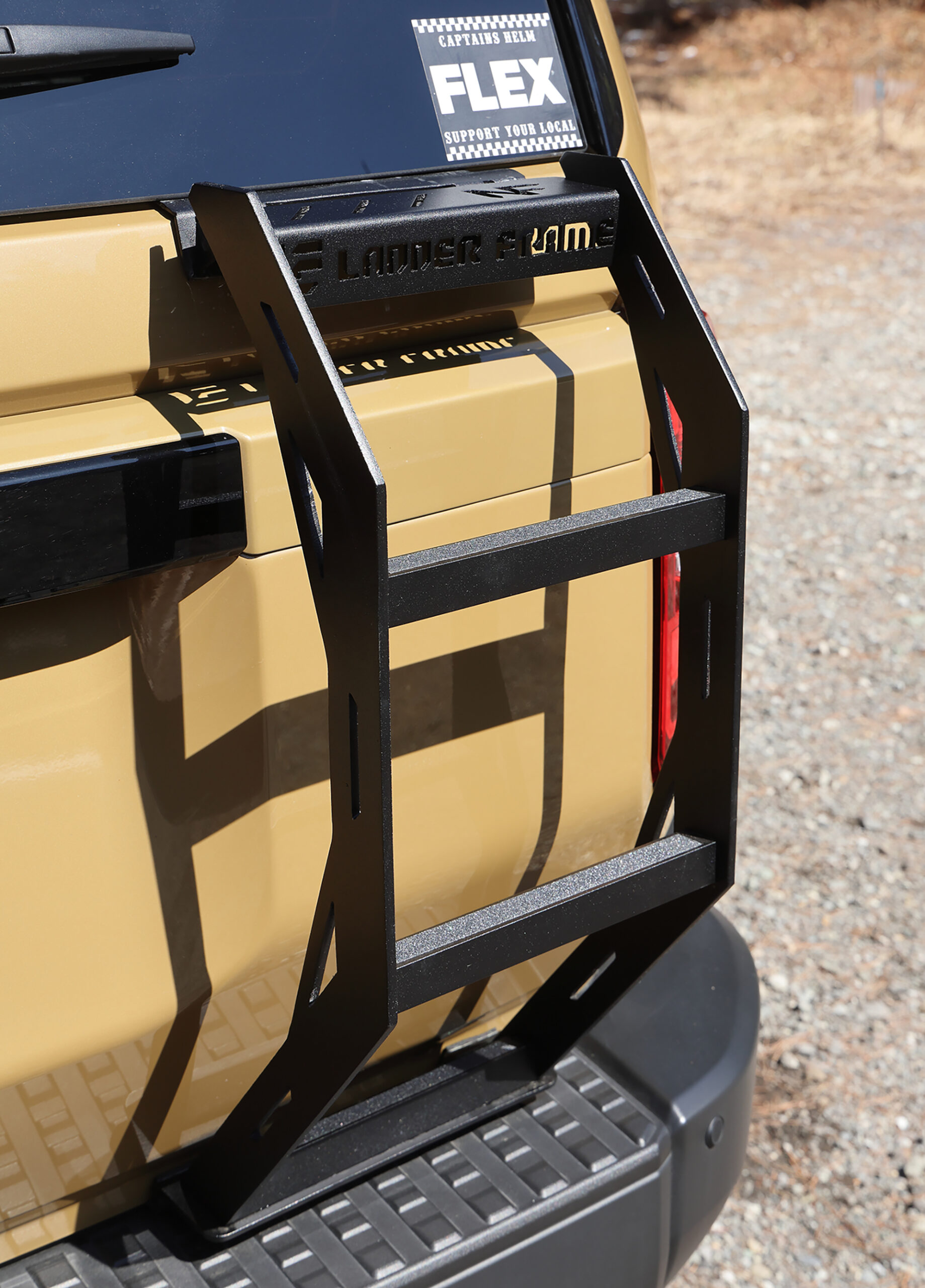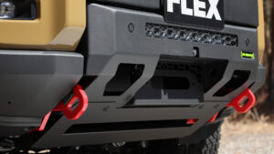 今回のデモカーはラックのフロントにLEDライトバーを備えていた。またキャリアにアクセスするために、FLEXの250はラダーフレーム製のショート丈のリアラダーをセットしていた。