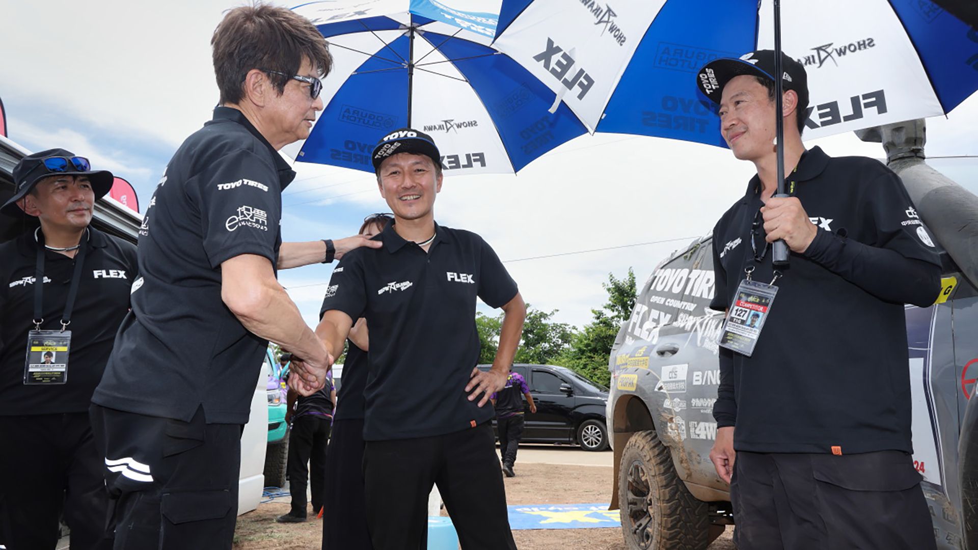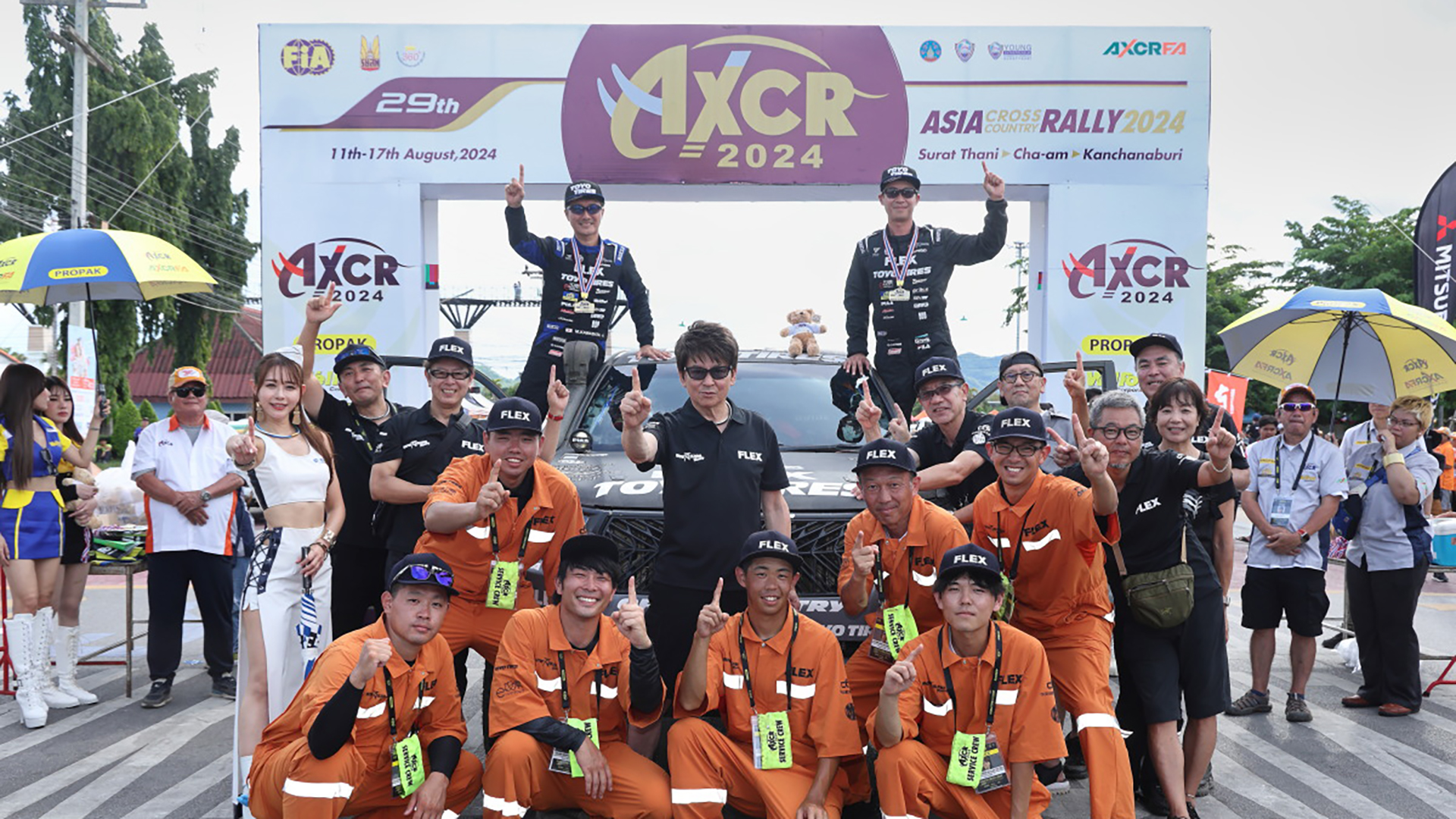 優勝の哀川 翔さんが総監督を努める『FLEX SHOW AIKAWA Racing with TOYO TIRES(ドライバー:川畑真人/コ・ドライバーDaychapon Toyingcharoen)』は、2024年8月11日〜17日にタイ王国スラタニ-カンチャナブリで開催された『アジアクロスカントリーラリー(AXCR)2024』に参戦。LEG5(SS5)まで19分差のあった2位から、最終SSの LEG6(SS6)で大逆転を果たし、わずか1分27秒の差という劇的なクラス優勝を飾った。