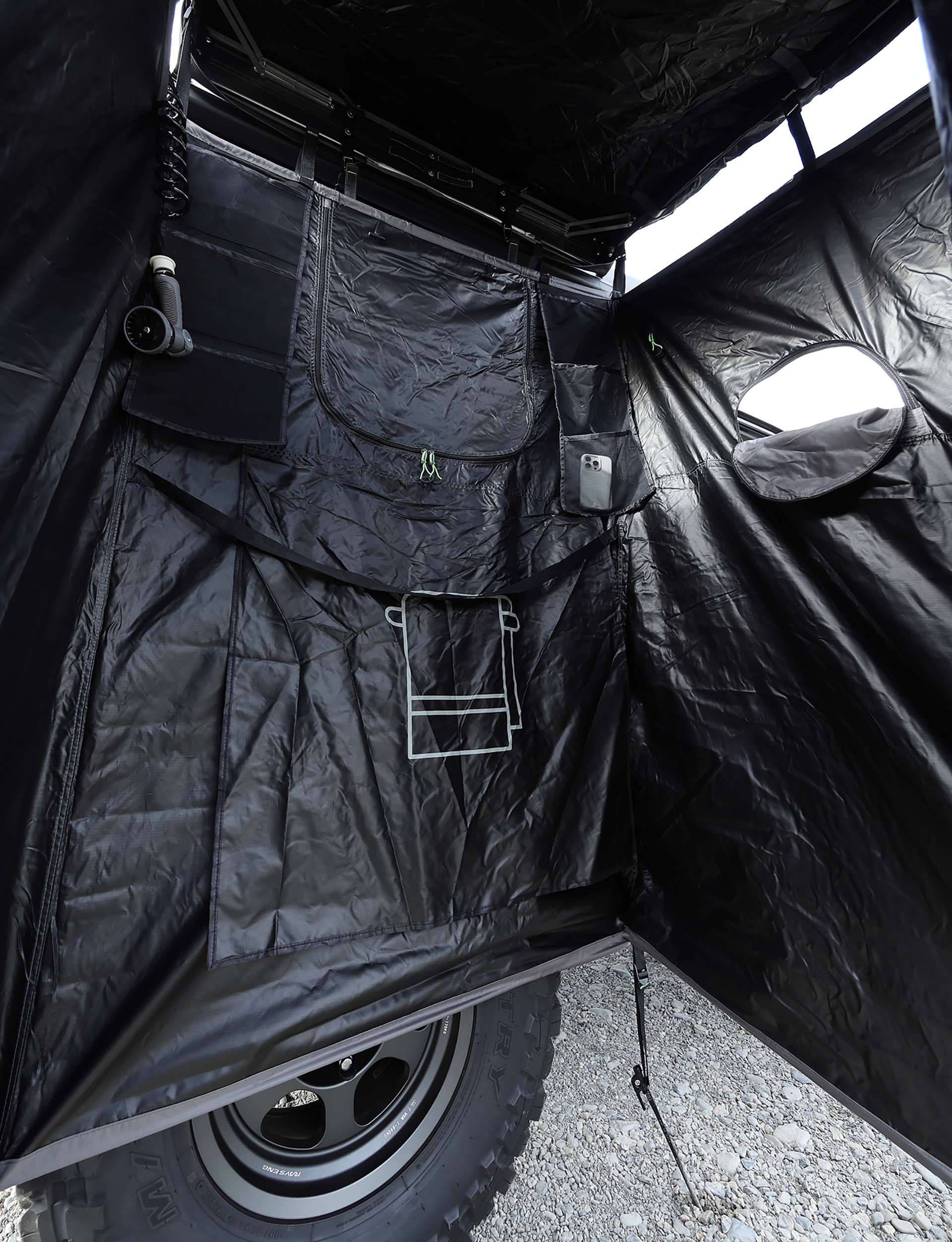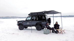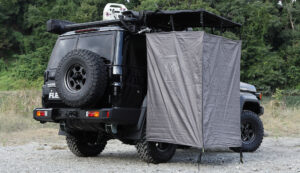 ルーフラックやカーオーニングにもアイアンマンを採用。これらも近年続々進化し、フレームの強度や耐久性が上がり、ペグダウンしなくても自立するものが主流(もちろん強風時にはペグダウンも可能)。さらにこれからのオーバーランドスタイルでのトレンドが、簡易シャワールーム。驚くほど簡単設営でルームが展開できる電動シャワーだ。水はルーフに取り付けたタンクから給水する。それぞれLEDライトも内蔵している。