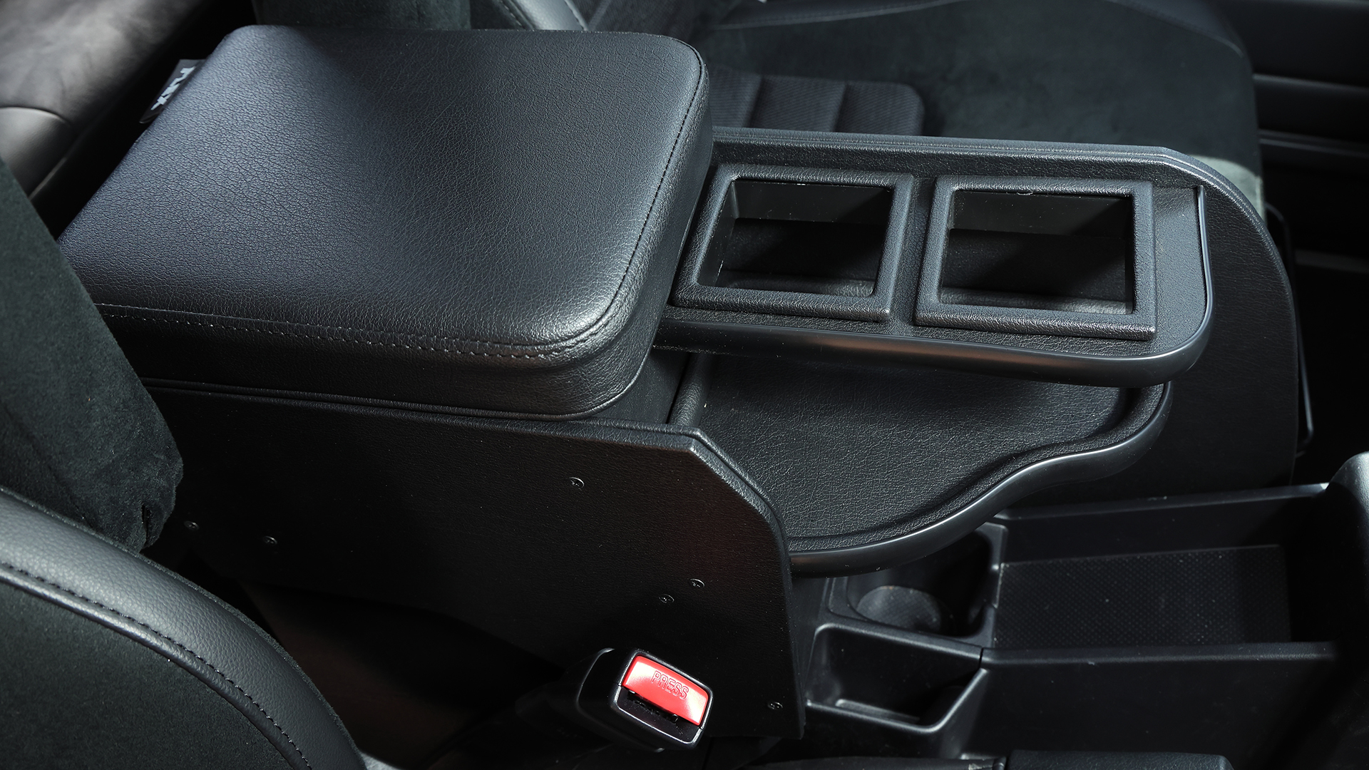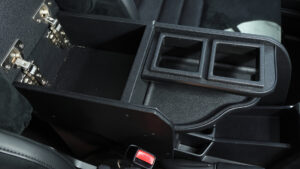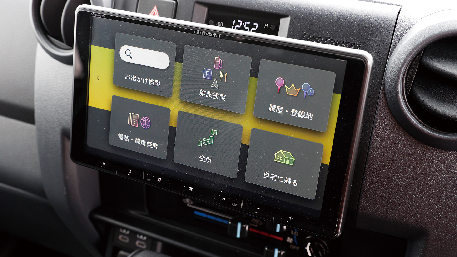 ランクル76の室内で注目なのが、新しく登場したFLEXオリジナルのセンターコンソールボックス。小物入れやカップホルダーを追加できるだけでなく、閉じた状態ではアームレストにもなる。これを搭載したほか、カロッツェリアのナビをインストールして快適化。