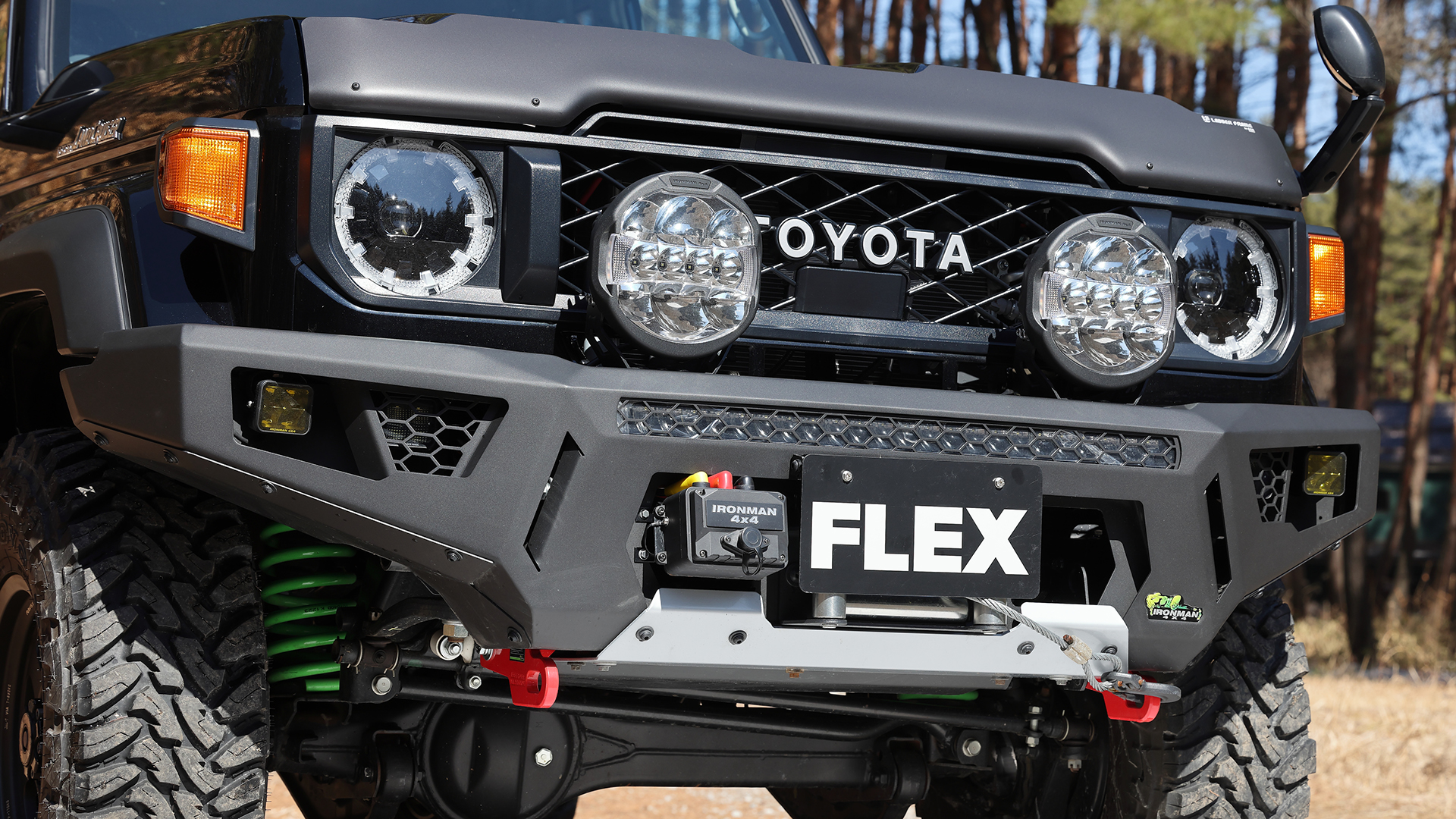 タイヤ&ホイール以外のカスタムは、ほぼ全身をIRONMAN 4×4(アイアンマン)で武装した再再販ランドクルーザー76。バンパーは強靭なスチールバンパーで76の無骨さにピッタリ!