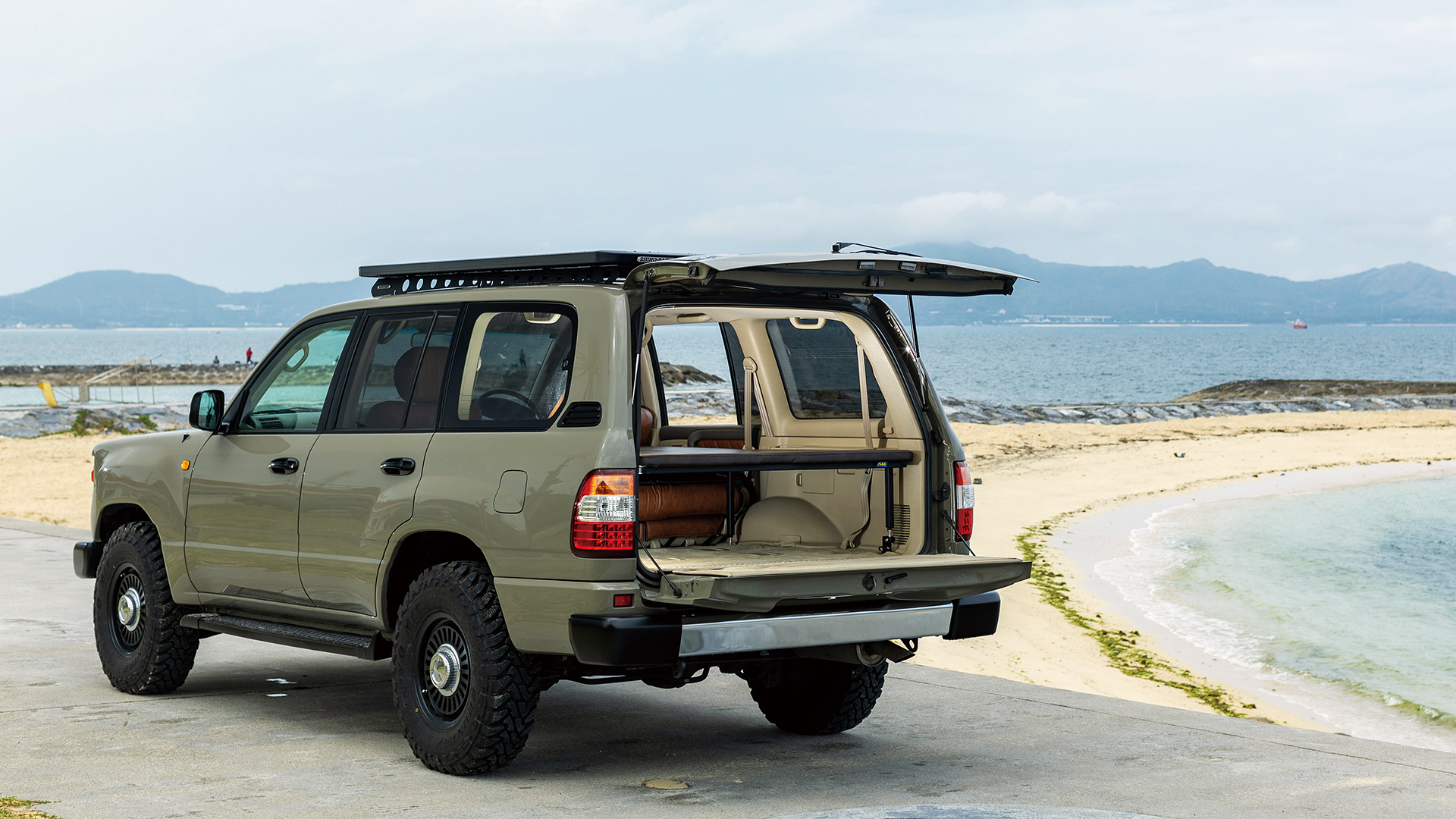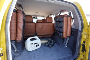 Renoca106およびランドクルーザー100のインテリアには、FLEXオリジナルアイテムを採用。シートカバーの装備やほかにも荷物の積載や車中泊に便利なベッドキットも好評を博している。 -