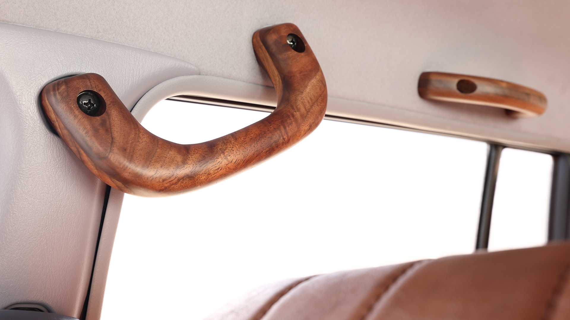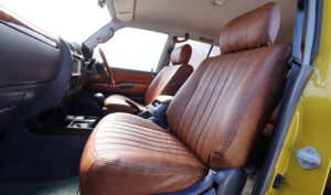 FLEXではランクル80、100、プラドシリーズ各車に向けた車種専用のオリジナルシートカバーも展開中。今回の90プラドベースのアメリカンクラシックが装着するのはFLEXクラシックシートカバー(キャメル)。ウッド調の内装のデモカーによく似合う。また、ウッド製アシストグリップの取扱いもスタート!