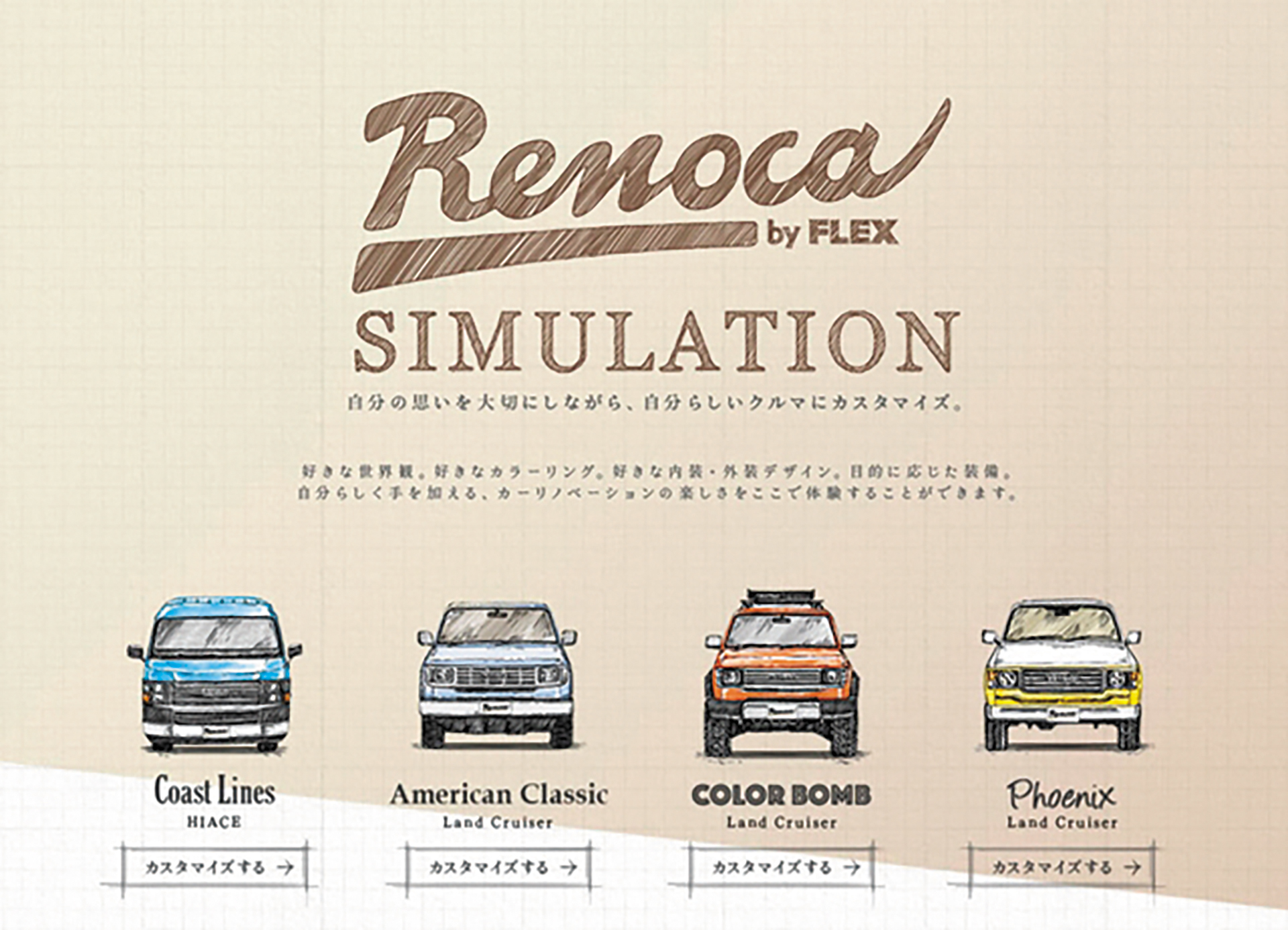 ひとつ世代を経るごとに大きく外観が変わってしまうスタイルの日本の自動車市場。とりわけトヨタで最長の70年超のヒストリーを刻むランクルでいうと、例えば60や70など、デザイン的に優れている“ある特定のモデル”の人気が高かったりする。 そんなランクルシリーズに対しての豊富なノウハウ、そして愛ゆえ、FLEX(フレックス)が展開するカスタムコンプリートブランドが『Renoca(リノカ)』だ。新車とも中古車とも異なる「リノベーションカー」というカテゴリーとして、いわゆるクルマのリノベーションを提案。コンセプトの定まったクルマをまず選び、その中にあるカスタムメニューから自分好みのスタイルやカラーで1台をつくる。そんな楽しみもあるモデルだ。 「自分らしさをどこまでも」という、テーマを掲げるリノカのラインナップには、ランクル100がベースの『Renoca 106(リノカ・イチマルロク)』やランクル90プラドをベースとした『Renoca AMERICAN CLASSIC(リノカ・アメリカンクラシック)』などがあり、本記事の冒頭でも述べた通り、現在相当な人気を集めている。 ではなぜこれらは人気なのだろうか? リノカの最大の特長は、106の場合はランクル60を彷彿とさせる角目丸目2灯Ver(もしくは4灯Ver)へ、アメリカンクラシックはスクエアな78プラド風のレトロなフェイスを採用していることに尽きる。 ちなみにグリルやヘッドライトベゼルにはイメージしたモデルの純正品を使用しているが、それを違和感なく溶け込ませるため、FLEXでは前後のアイアンバンパーやボンネット、さらにフェンダーなどを独自に採用している。 もうひとつのポイントが、レトロ感を主張するボディ色の採用。アースカラーをはじめ、16種類のスタンダードカラーを用意しているが、トヨタだけでなく他メーカー含むクルマの純正色ならば、リノカで選ぶことができる。 なお、ボディ全塗装の際には車体のキズやヘコミ修正に加え、モールやサイドパネルを撤去している。これがシンプルなクラシックスタイルにするための大事なポイント。また、撤去した後にパテ痩せが生じないように装着用の穴を溶接で埋めるというコダワリも。この手法は106のテールゲートにも用いられ、テールランプを外した後スムージング加工のような工程を経る。足し算のカスタムでなく引き算というのは、実に面白い。 オールドランクルのスタイリングには惹かれるが、信頼性や安全性、何かあった時に心配という人には『106』や『アメリカンクラシック』といったリノカは打ってつけ。誰もが気軽に往年のランクルのクラシック感を手に入れることができる。また、不変のエクステリアゆえ、急にデザインが野暮ったくなるような心配はない。だから愛すべき存在として飽きることなく、長く乗ることができるのだ。