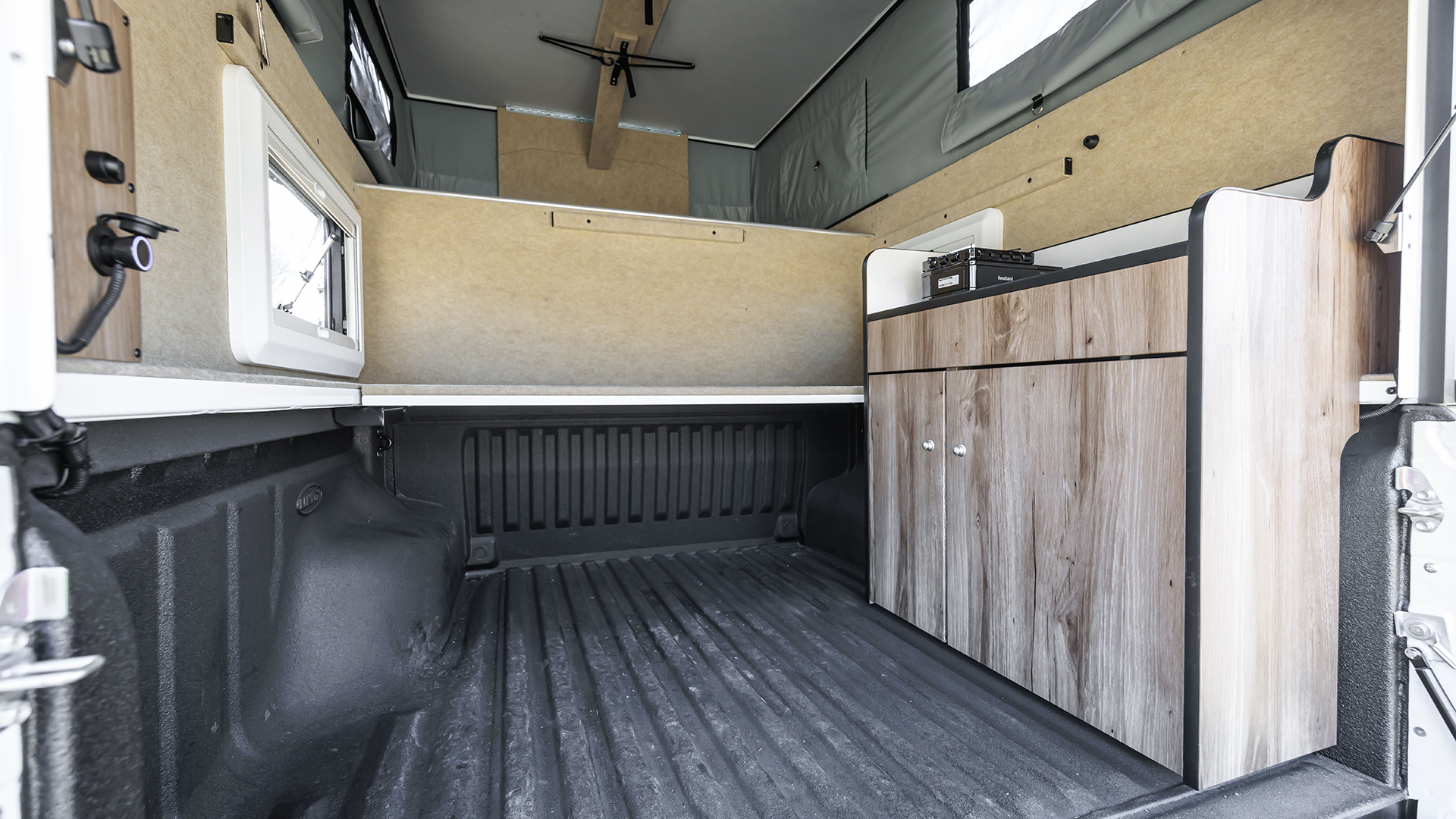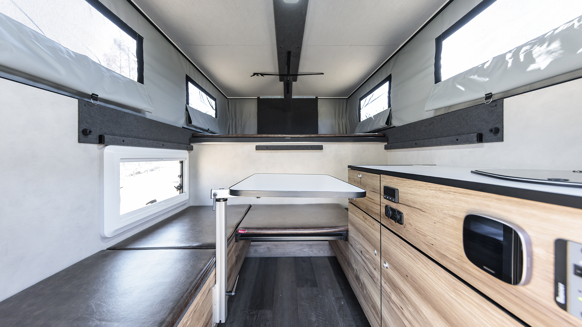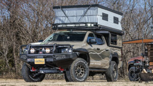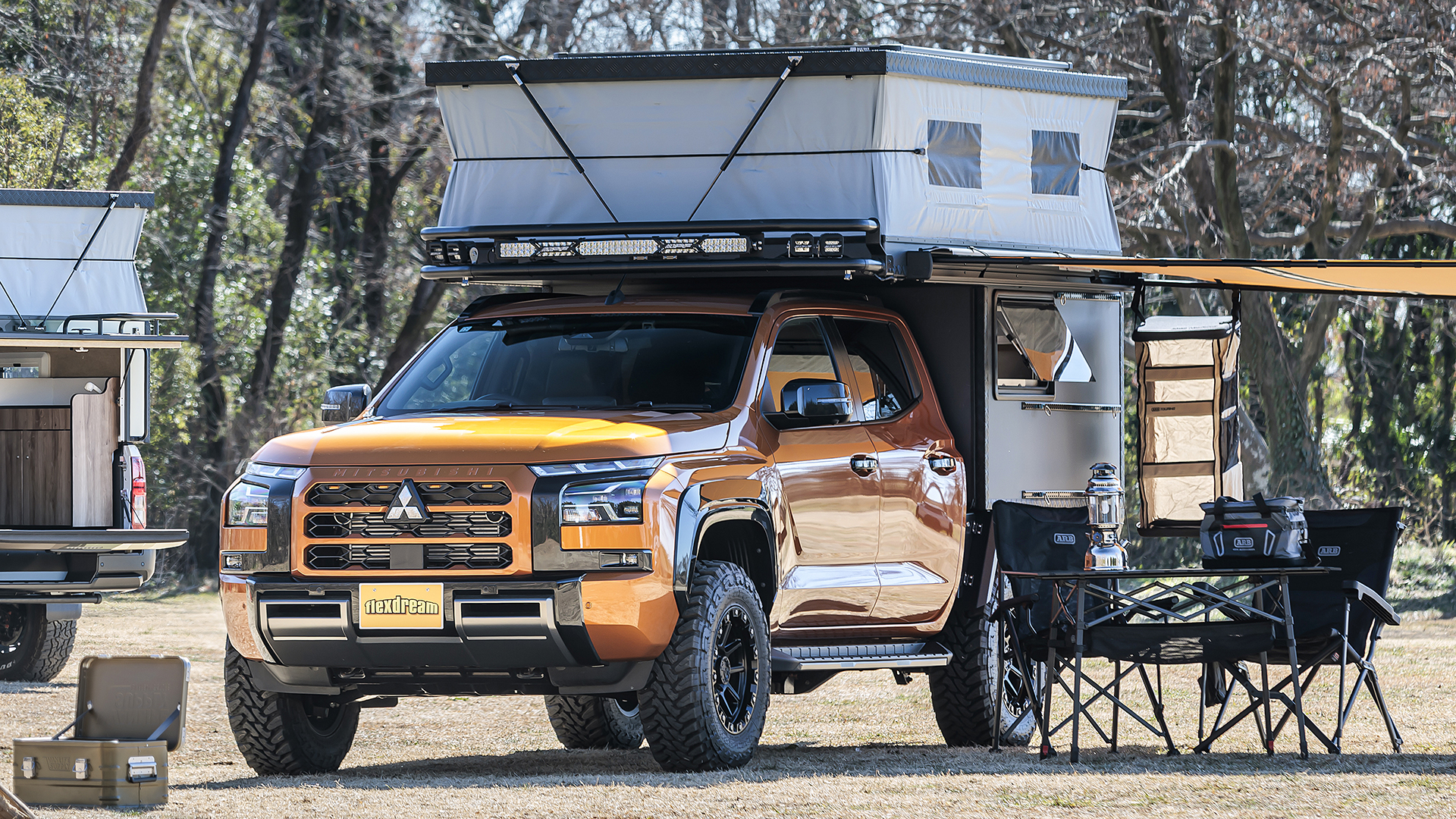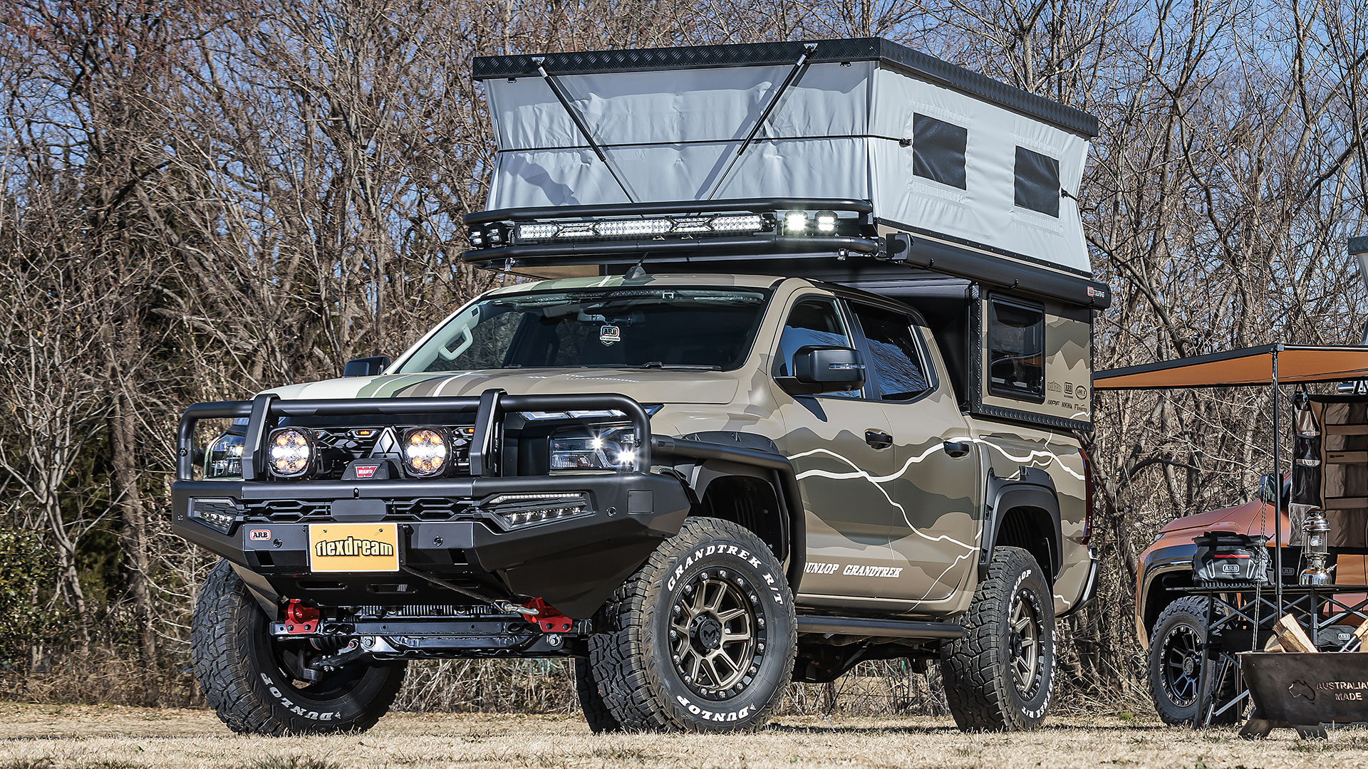 フレックスドリームが正規ディーラーとして取り扱う「FT PORTER」はピックアップトラックをベースとしたオーバーランドスタイルのキャンピングカー。垂直方向へPOPアップすれば広い空間が確保できる。収納時に車体の高さを抑えられるため日常使いも可能。8ナンバーキャンピング登録も可能。
