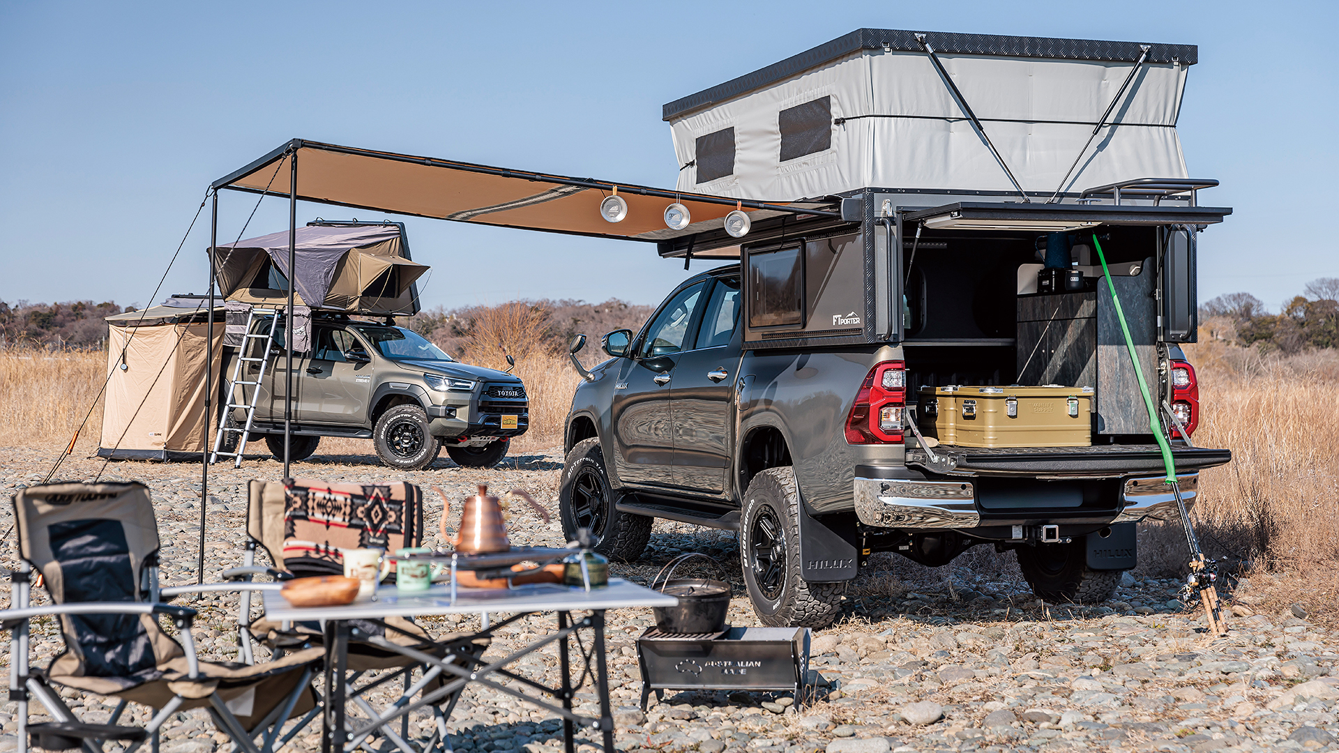オーバーランドスタイルを知り尽くし、よりアクティブなライフスタイルを楽しめる提案をしてきたFTポーターがトライトンで登場。GLS(ブラウン)にはベーシックなFTポーターキャンパーパッケージ(25年モデル)を装着。GSR(オレンジ)はノーマルベッドを交換し上級モデルとなるFTポーターエンデューロを搭載。