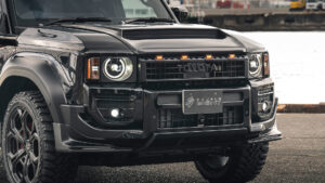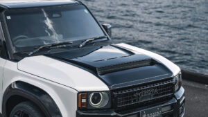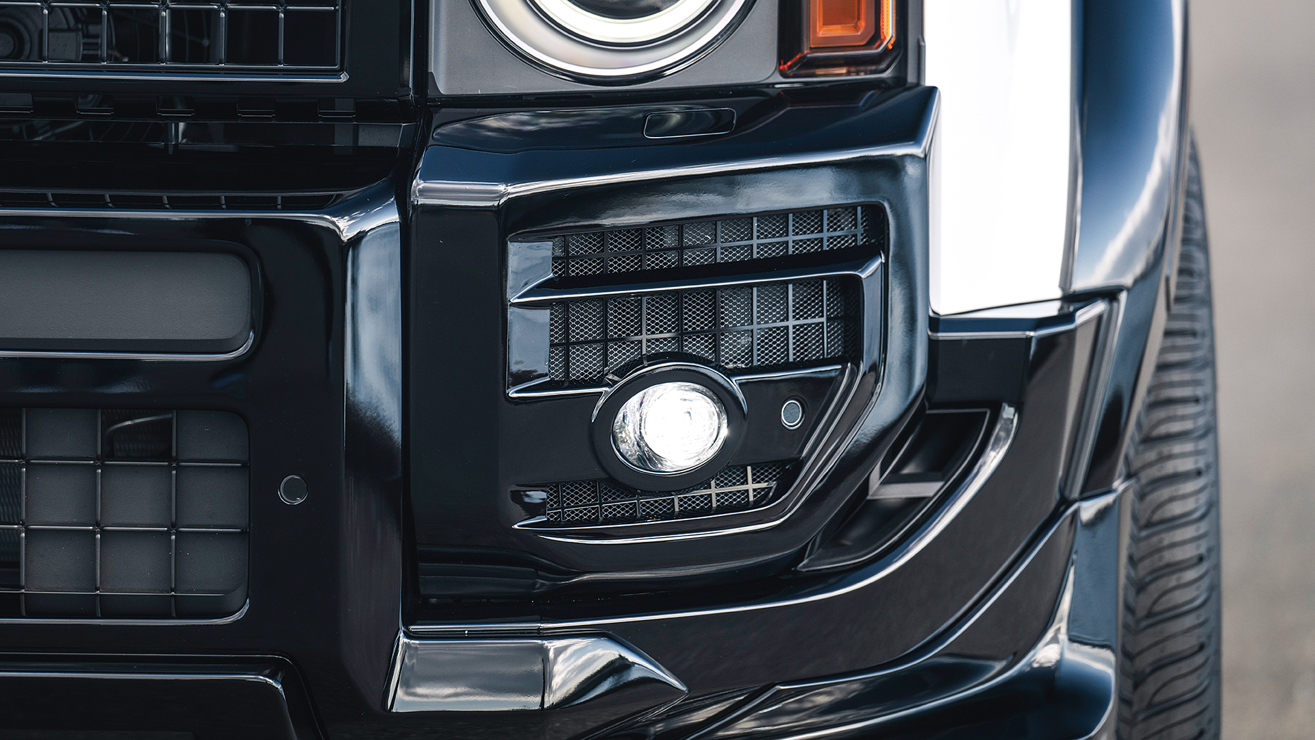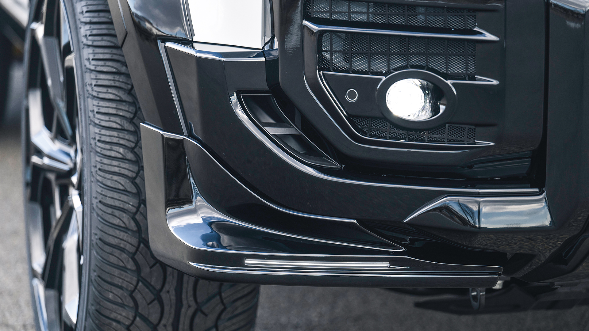 グリル下にはバンパーカバーを、ヘッドライトの下にはフォグカバーを装着。丁寧な作りこみに加えてエアインレットも装備しており高級感もアップするアイテムだ。ボンネットにはボンネットフードカバーを取り付けて迫力のスタイリングを完成させている。