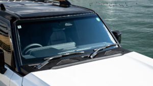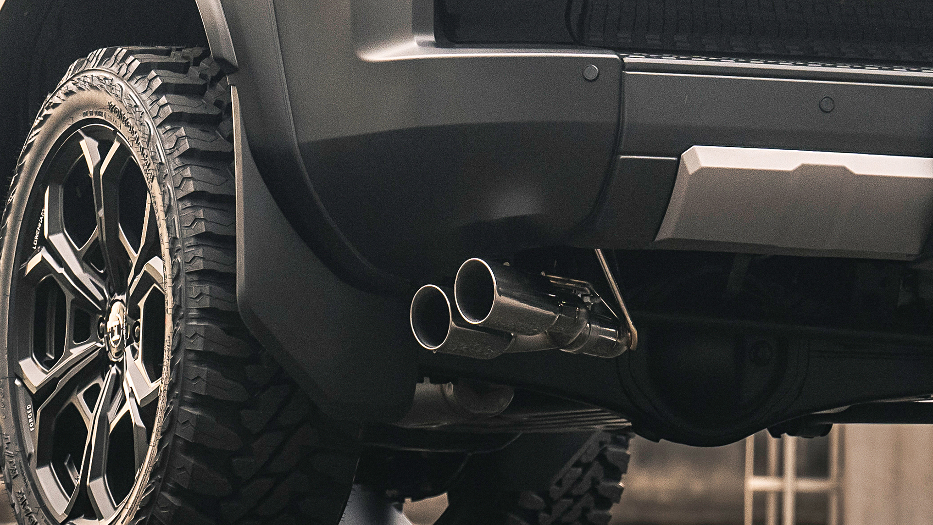 さらにマフラーはスラッシュカットのエンドがかっこいいリアサイド出しツインマフラーに換装しワイルド感をアップ。こうした大きな部品だけでなくスモールパーツが揃っているのもGMGの魅力。例えばリアドアやクオーターのガラスにはウィンドウパネルを装着しオフロードテイストも高めている。