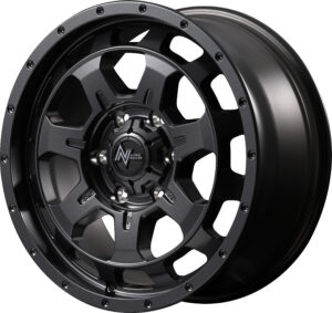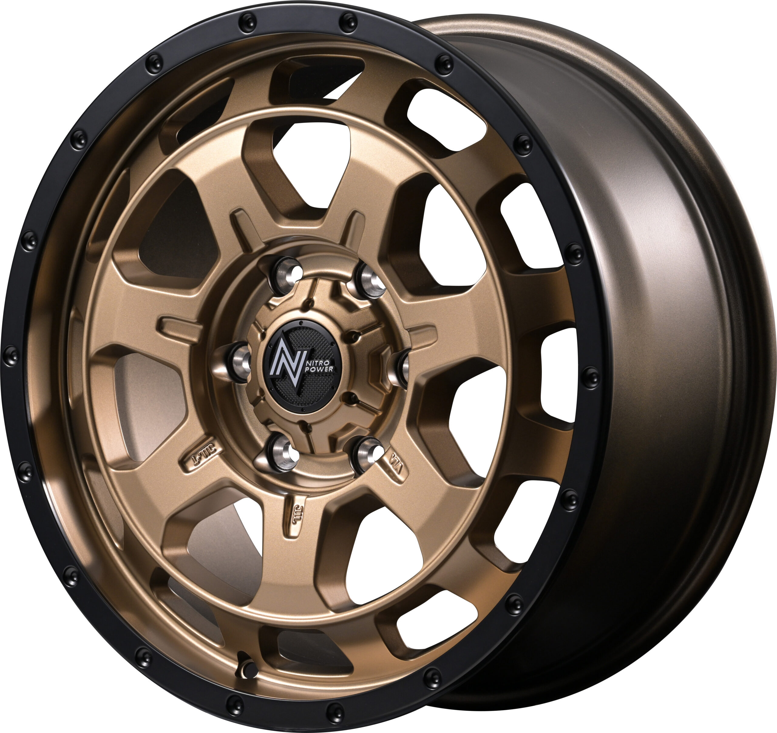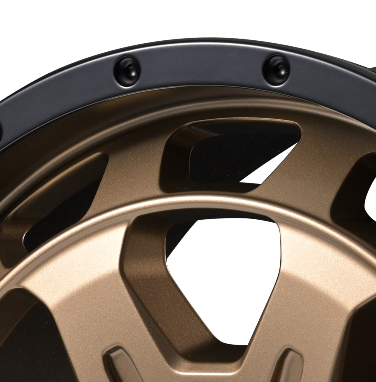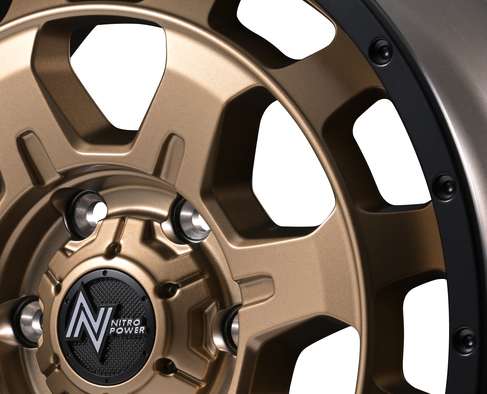 新作「M7ファランクス」。ビードロックデザインを採用し、ウェルから立ち上がったリムフランジをアンダーカットすることで立体的な造形に仕立てている。スポークエンドにはナイトロパワーらしいラギッド感を強める12個のホール(シューティングホール)を大胆にレイアウト。このシューティングホールはタフなイメージを生み出しつつ、軽量化にも寄与した機能美とも言える部分である。重厚な7本スポークはあえて短めにすることで、塊感と深い落ち込み感のある断面としている。このタフで重厚な作り込みが本格4WD車の足もとに強烈なインパクトをプラスする。カラーは、バレルブラックとマットブロンズ/リムブラックの2色から選べる。