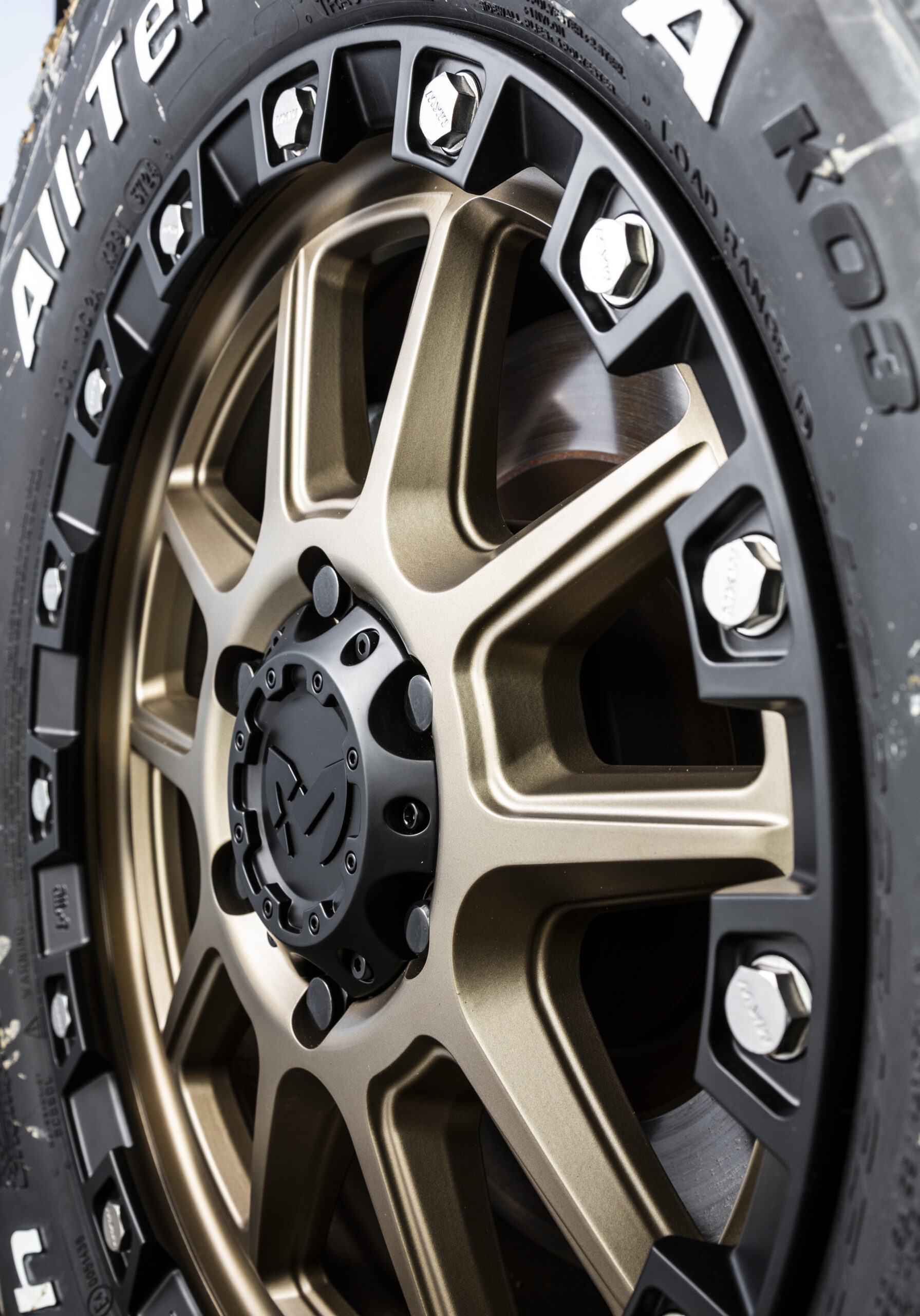 MKW オフロードシリーズの特徴のひとつが、ディスクの上にかぶさるようにデザインされたリアルなビードリングスタイルの採用。アメリカンスピリッツを宿すUS発のビードロックホイールテイストのリムフランジはまさにド迫力!
