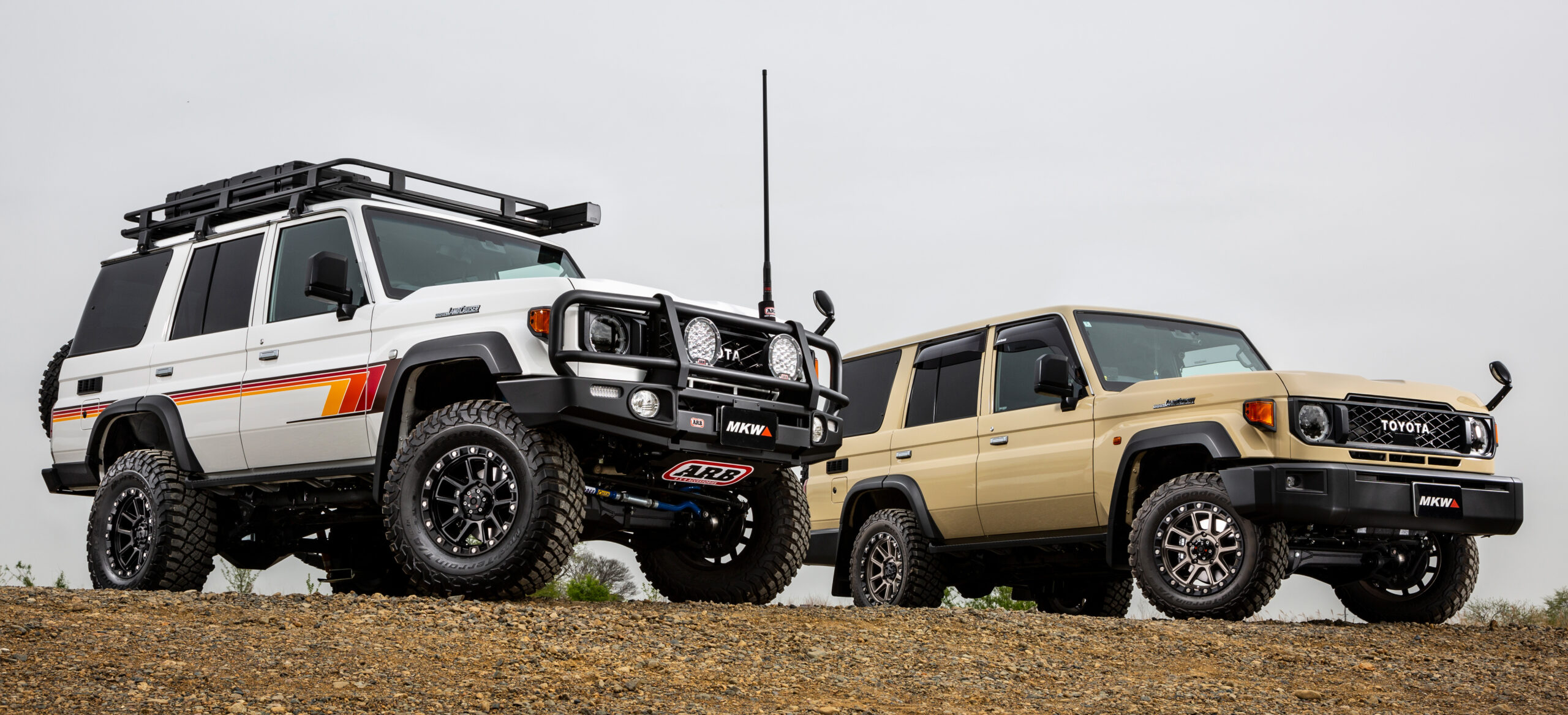 ランクル250に18インチのM205 JPスペックを装着した姿はとにかくアグレッシブ! 一方、再再販ランクル70にはM205 USスペックの17インチをセット。実はこのインセット-10のモデルは、70専用に設定されたサイズ。当然マッチングは抜群だ。なお、70専用サイズはセンターキャップレス仕様だが、ビス穴が無くスッキリした見映えになることも特徴だ。