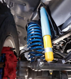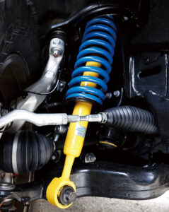ガソリン車専用のコイルスプリングで2インチリフトアップ。ノーマルよりも長いスペシャルビルシュタインを組み合わせる。ディーゼル車用のスプリンングも計画中だ。