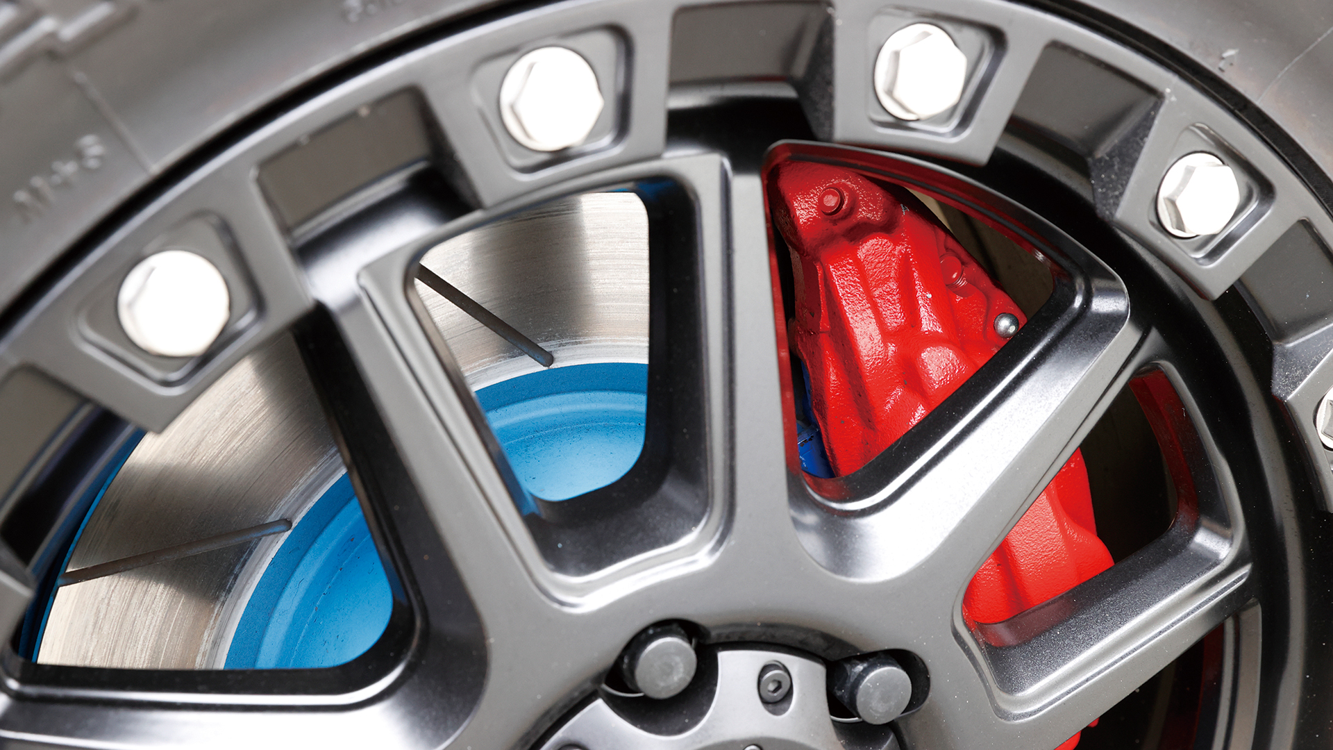 前後のブレーキパッドとローターをモトレージ製品に変更。制動性能だけでなく放熱性も高め、重い4WDを確実に止めてくれる。