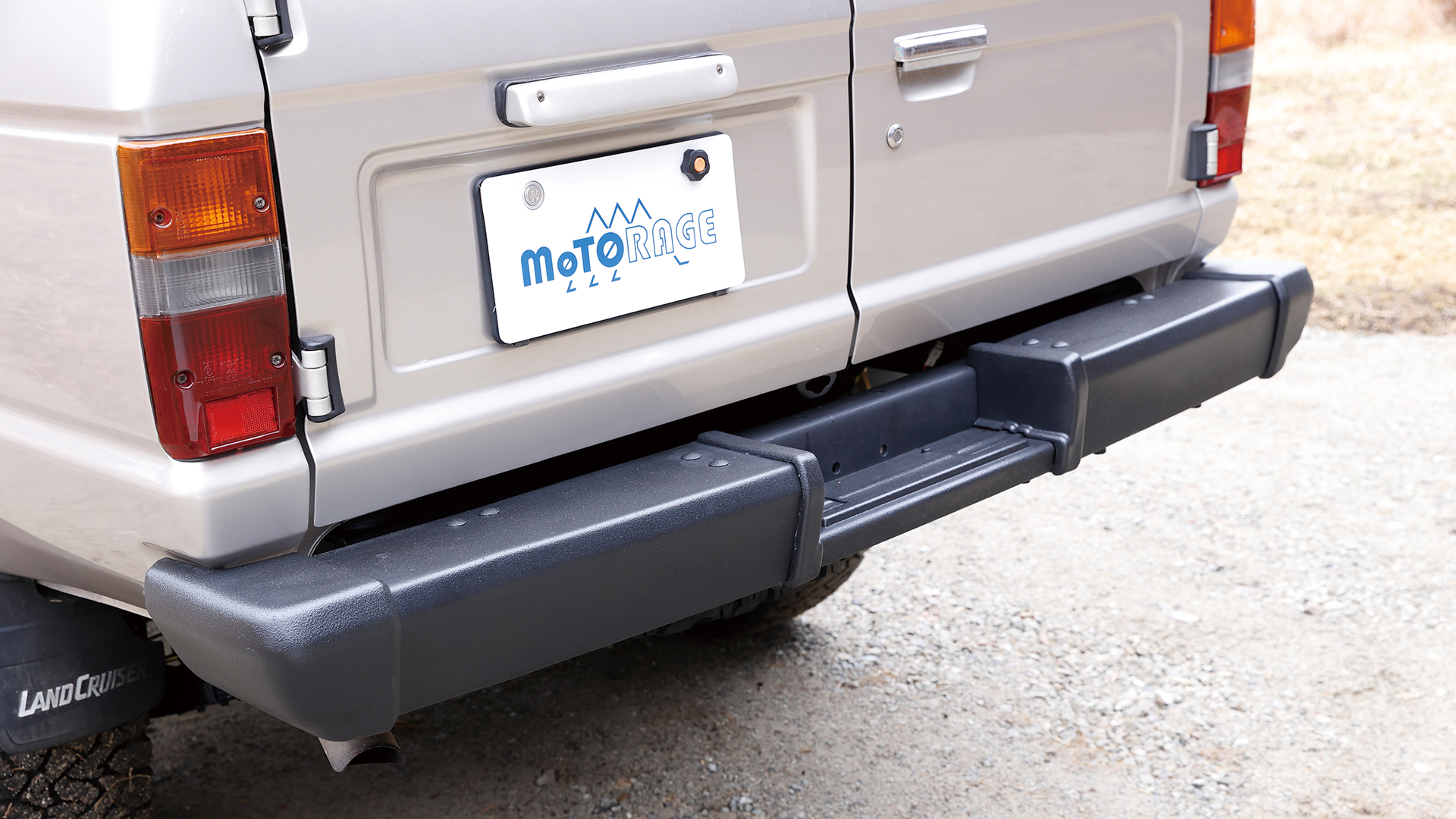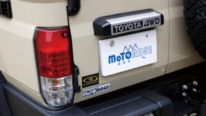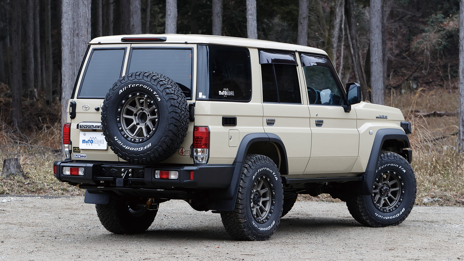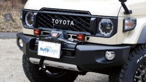 リフトアップのためにリーフスプリングを交換すると構造変更が必要となり、車検を取り直す必要がある。GDJ76の場合ワゴン登録なので車検期間が長く、構造変更を嫌う人も多いのでは?そこでモトレージでは、構造変更が不要なアシストリーフを製作。他にもウインチが搭載可能な樹脂製バンパーや、大径スペアタイヤタイヤを装着しても開閉できるキャリアも設定。ランクル250と同様に、下回りのガードやブレーキもしっかり強化する。