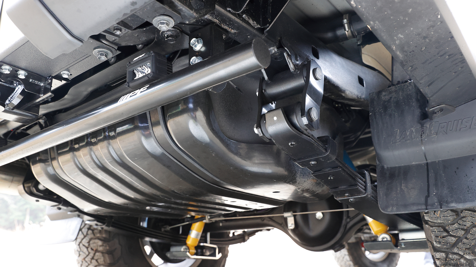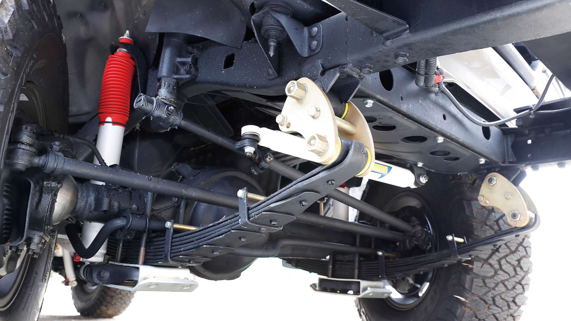フロントはコイルスプリングを変更、リヤは純正スプリングにアシストを追加しリフトアップ。構造変更が必要だが、ヘビーデューティなユーザー向けにリープスプリングも発売中。