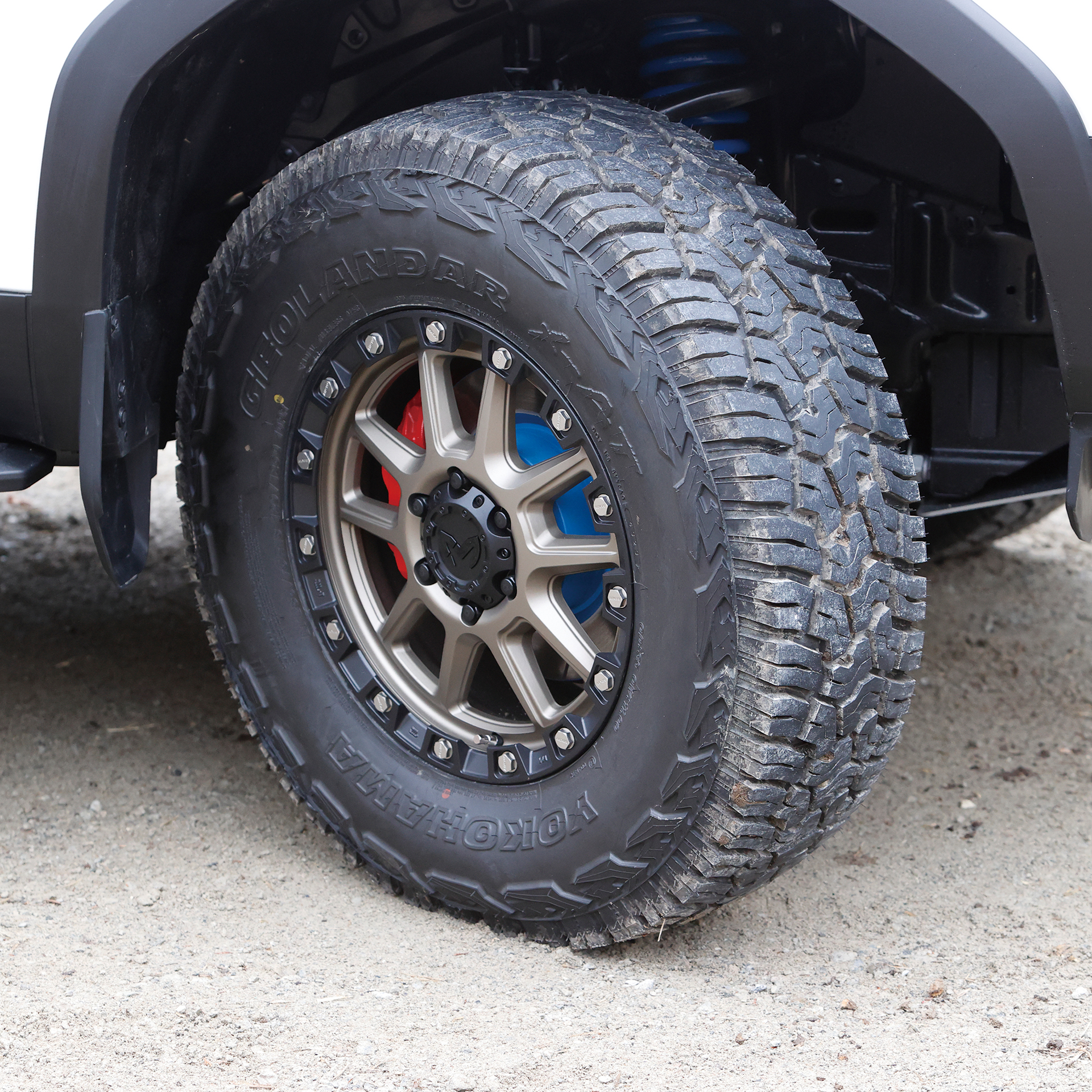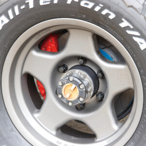 2インチリフトアップしたことで、285/75R18とかなり大きなタイヤが装着可能。ホイールはMKWのM205。細くスポーティンなデザインなので、スリットローターの存在を強調。