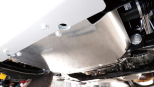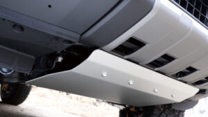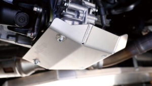 バンパー奥のスキッドプレート、車体中央のアンダーガード、タンクガードを装備。いずれもジュラルミンを採用しており、ボディ各部をしっかり保護してくれる。