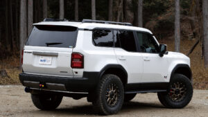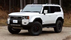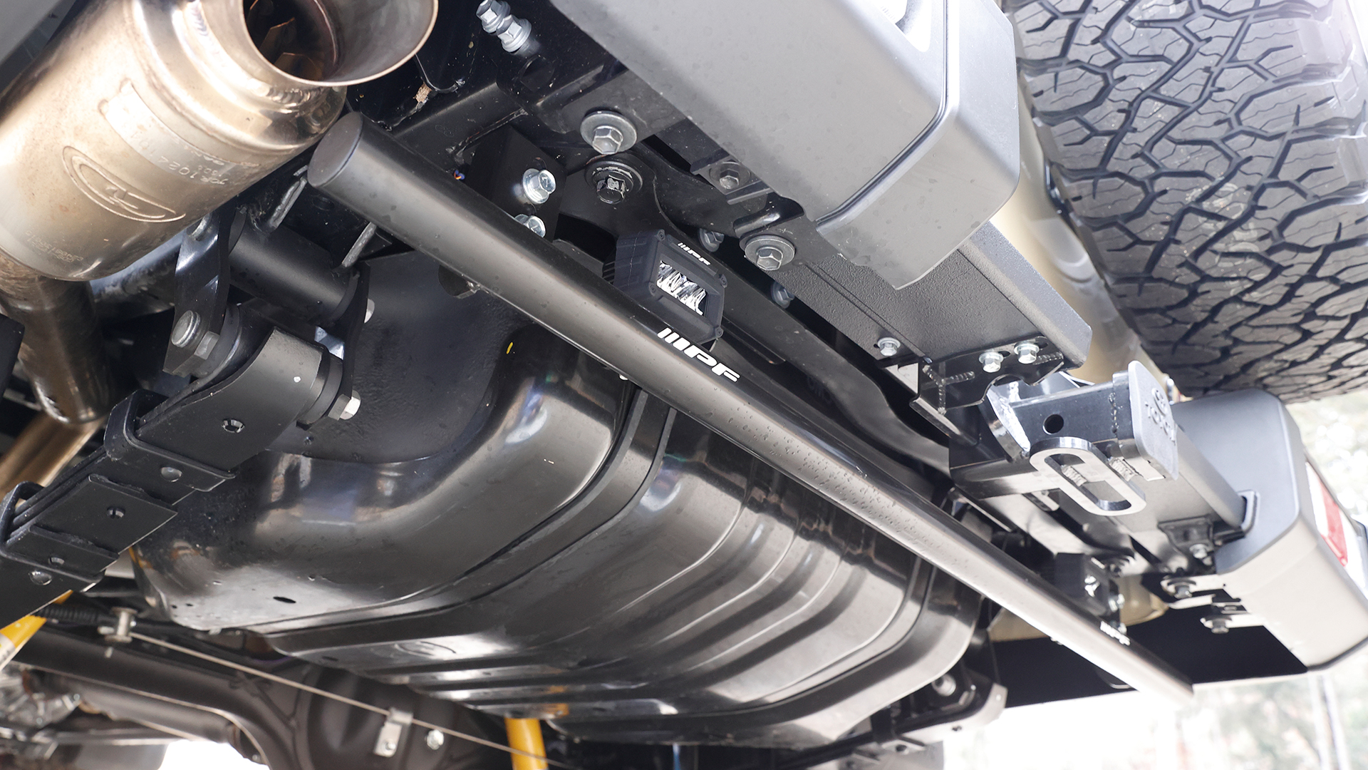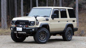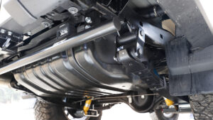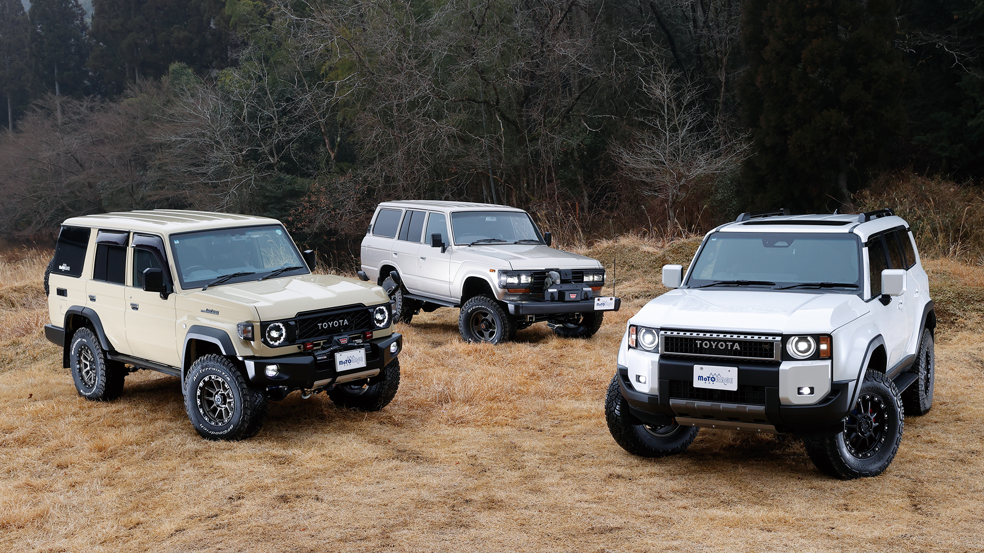 これからのメイン車種となるランクル250。もちろんモトレージでも各種パーツの開発に着手しており、まずはガソリン車からスタート。オリジナルのコイルスプリングと専用ビルシュタインショックに交換し、約2インチリフトアップ。タイヤサイズは285/75R18に変更し、まさに威風堂々とした佇まいを実現する。オフロードでのトラブルを予防するため、頑丈なスキッドプレートやアンダーガード、タンクガードを一式装備する。