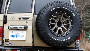 スペアタイヤも装着タイヤと同じサイズにするのが理想的。だが左側が開けられなくならない様に、タイヤを右上にオフセットさせるスペアタイヤキャリアを装着する。