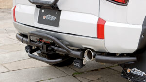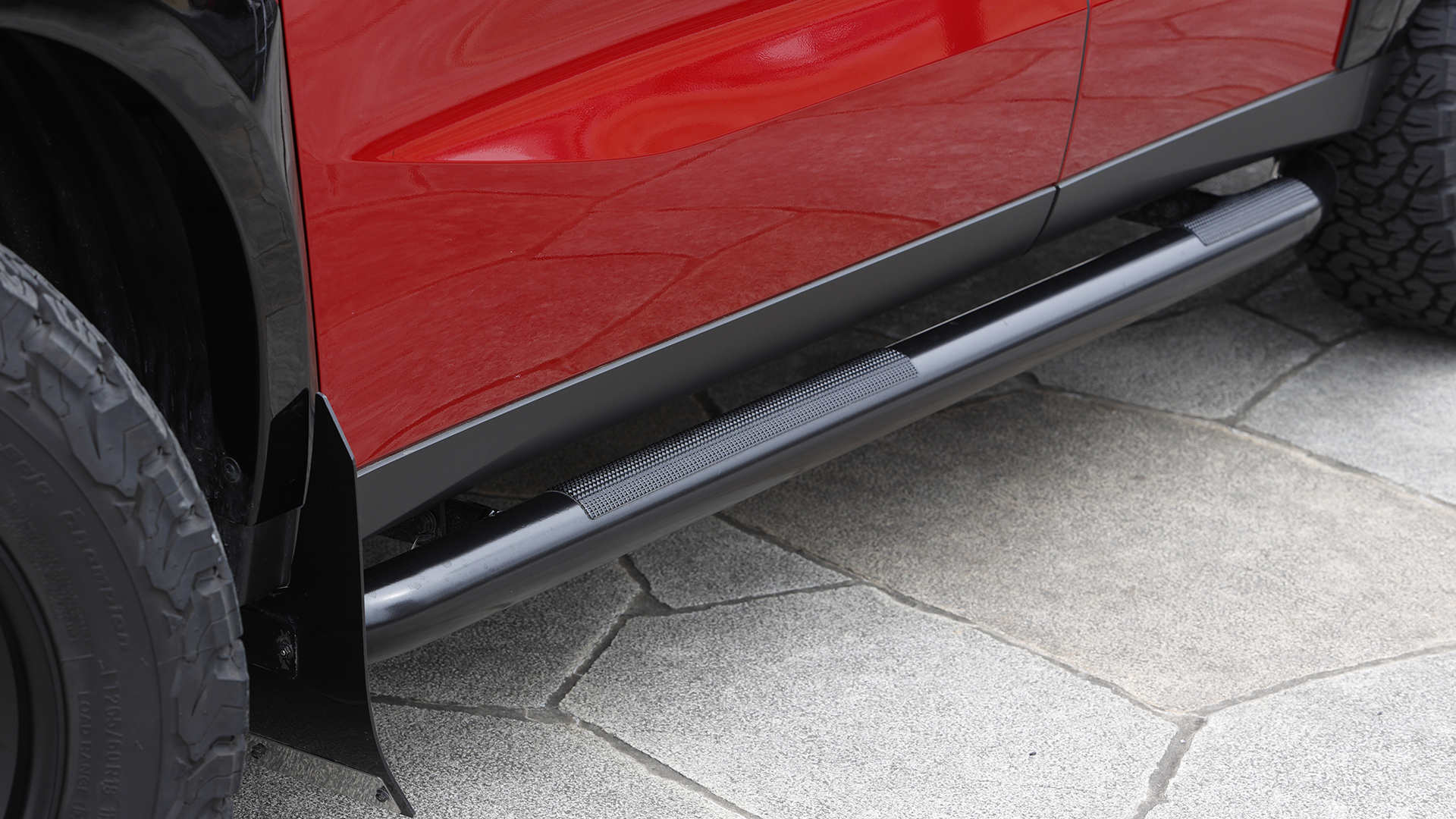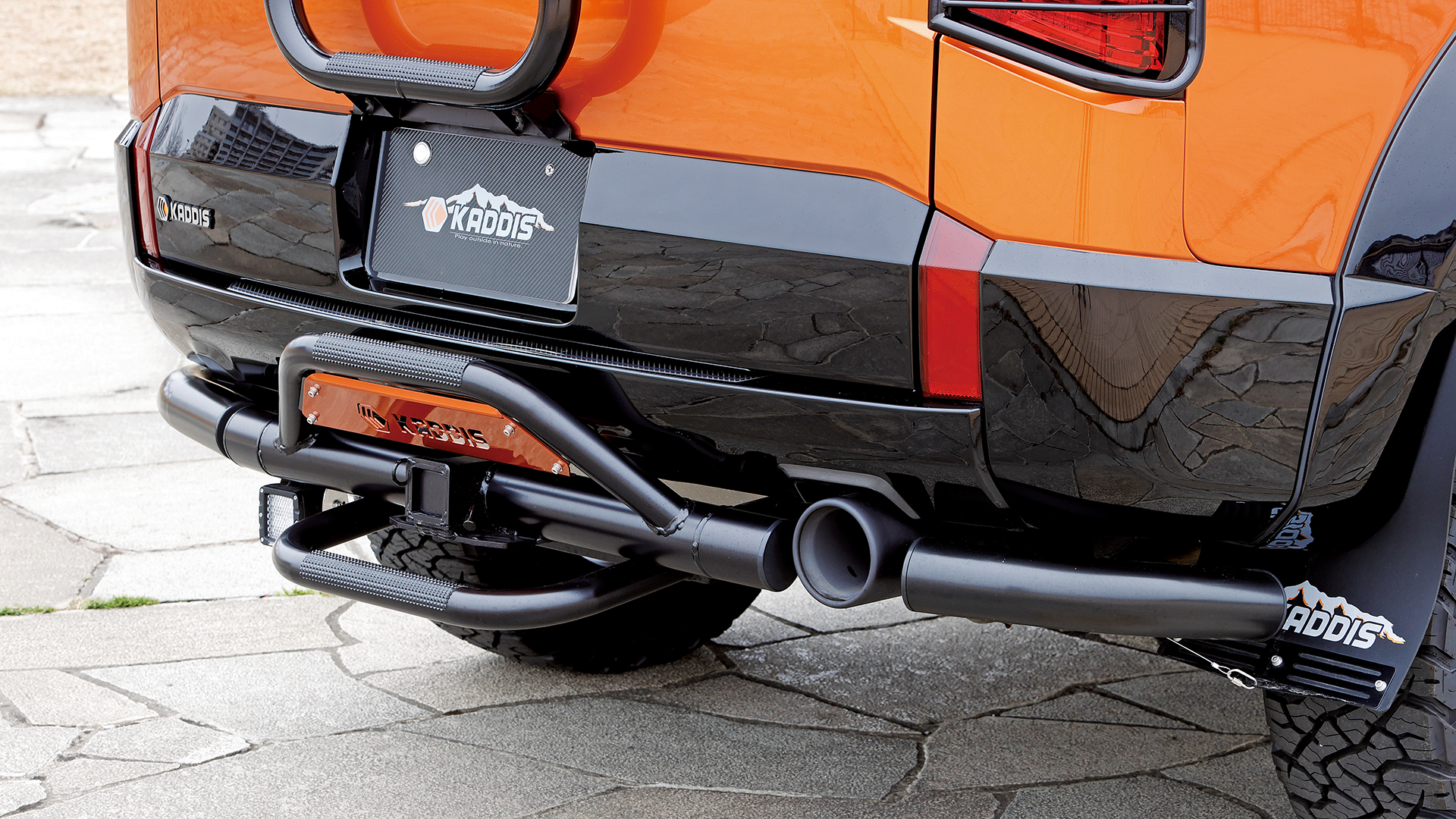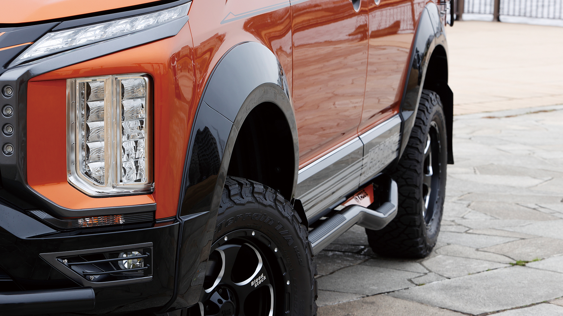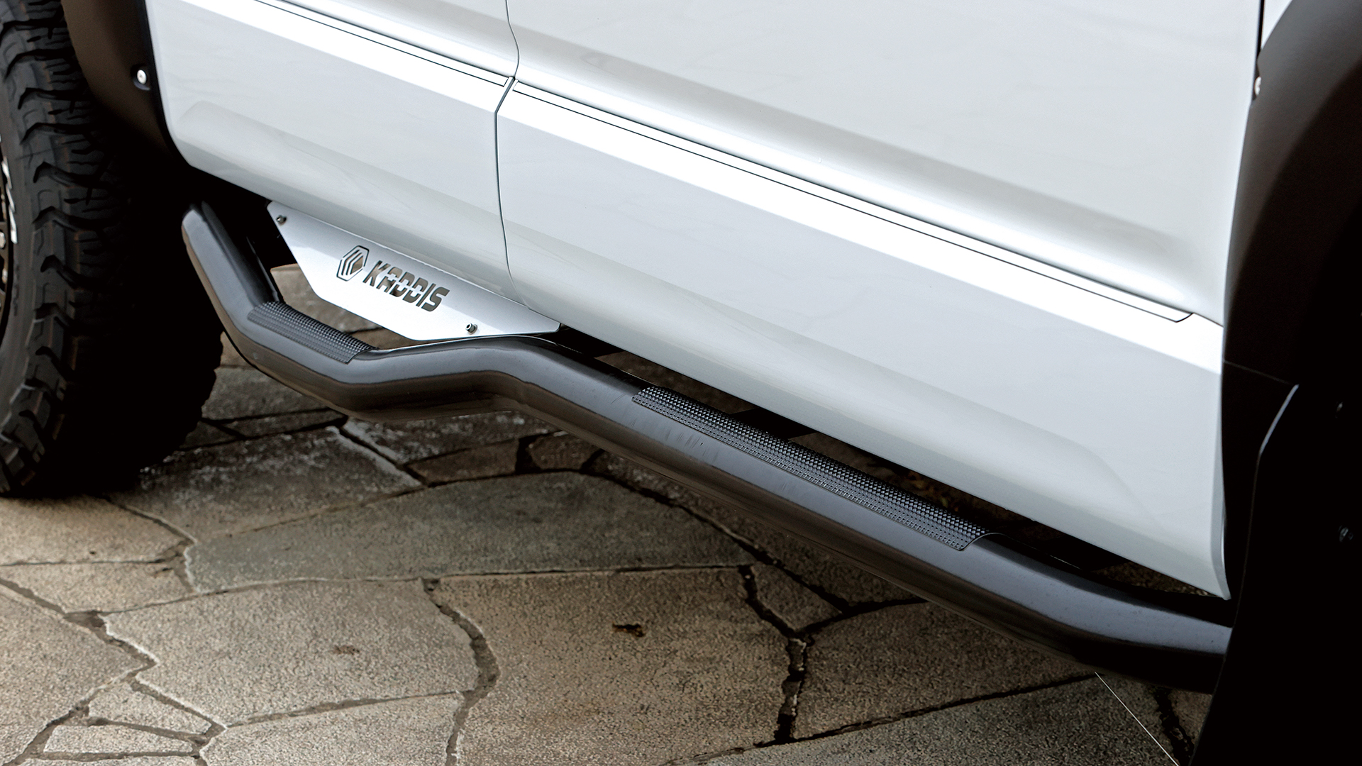 ドレスアップ性だけでなく機能性も追求したアイテムである、サイドステップやリアトレイルヒッチ&リアサイドガードなどを含め、フル装備している。