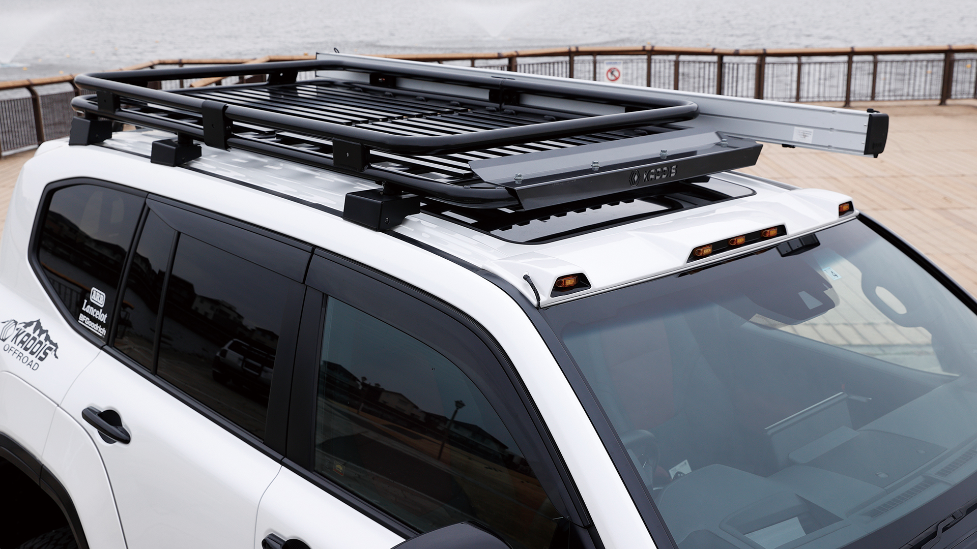 ランクル300のルーフを覆い尽くすほど大きなルーフキャリアは、積載量を優先しつつ、実用性を重視した形状を採用。、またサイドオーニング装着ためのアタッチメントやディフレクターも搭載。さらにルーフ先端にはマーカーランプを装備して主張。