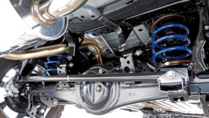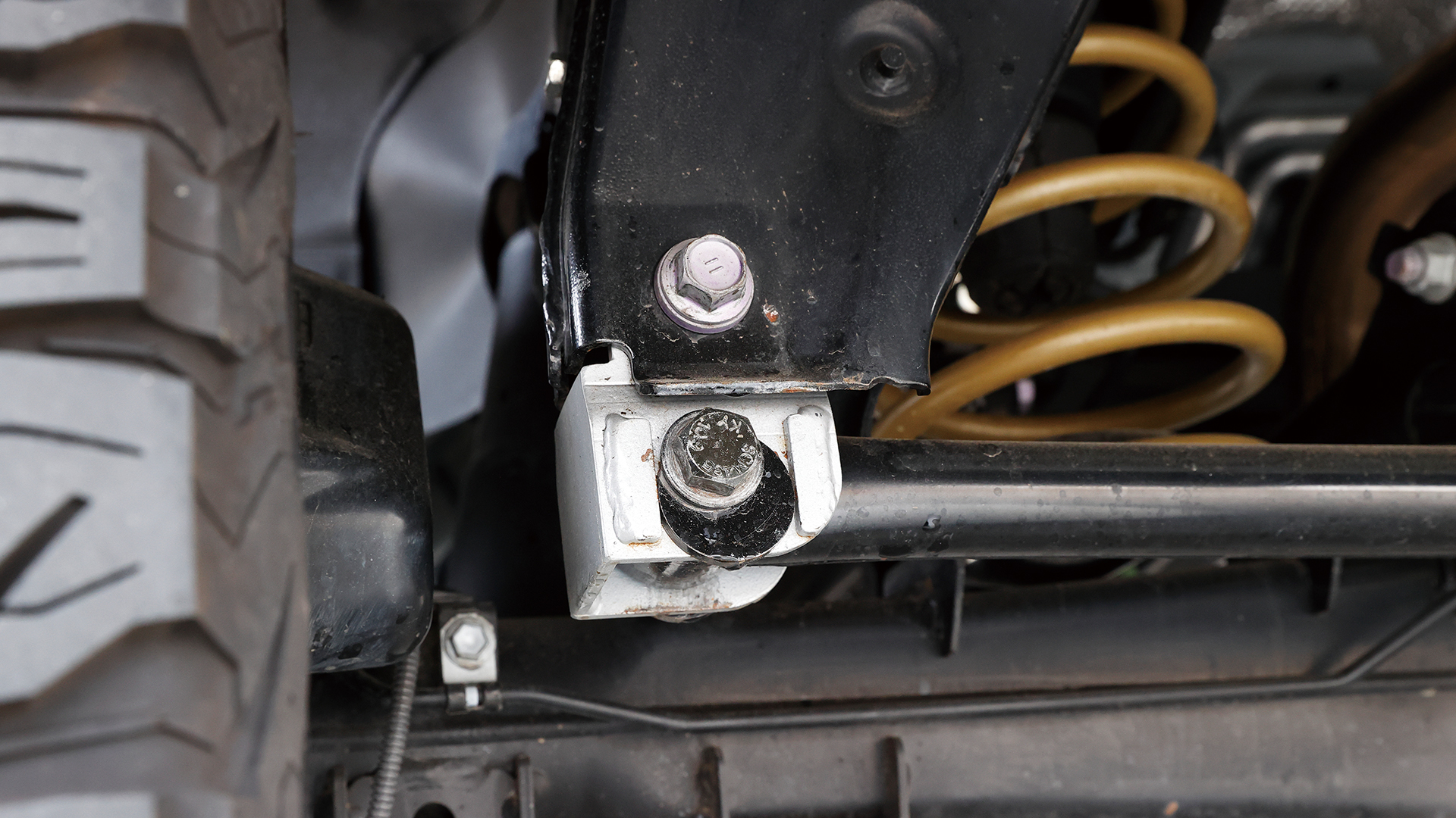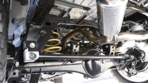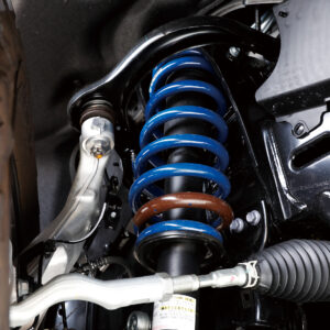 ボディとフレームをつなぐマウント部分でリフトアップするのが、ロードハウス独自の手法である「ボディアップマウント(実用新案登録済)」。車高を高めにしても操縦安定性はノーマルと同等レベルを維持し、駆動系への負担も軽減される画期的なメニューなのだ。さらにリヤサスペンションのラテラルロッドは水平に装着されるのが理想であるため、同時にそれを実現すべくダウンブラケットも追加。不快な横揺れの発生も抑制している。