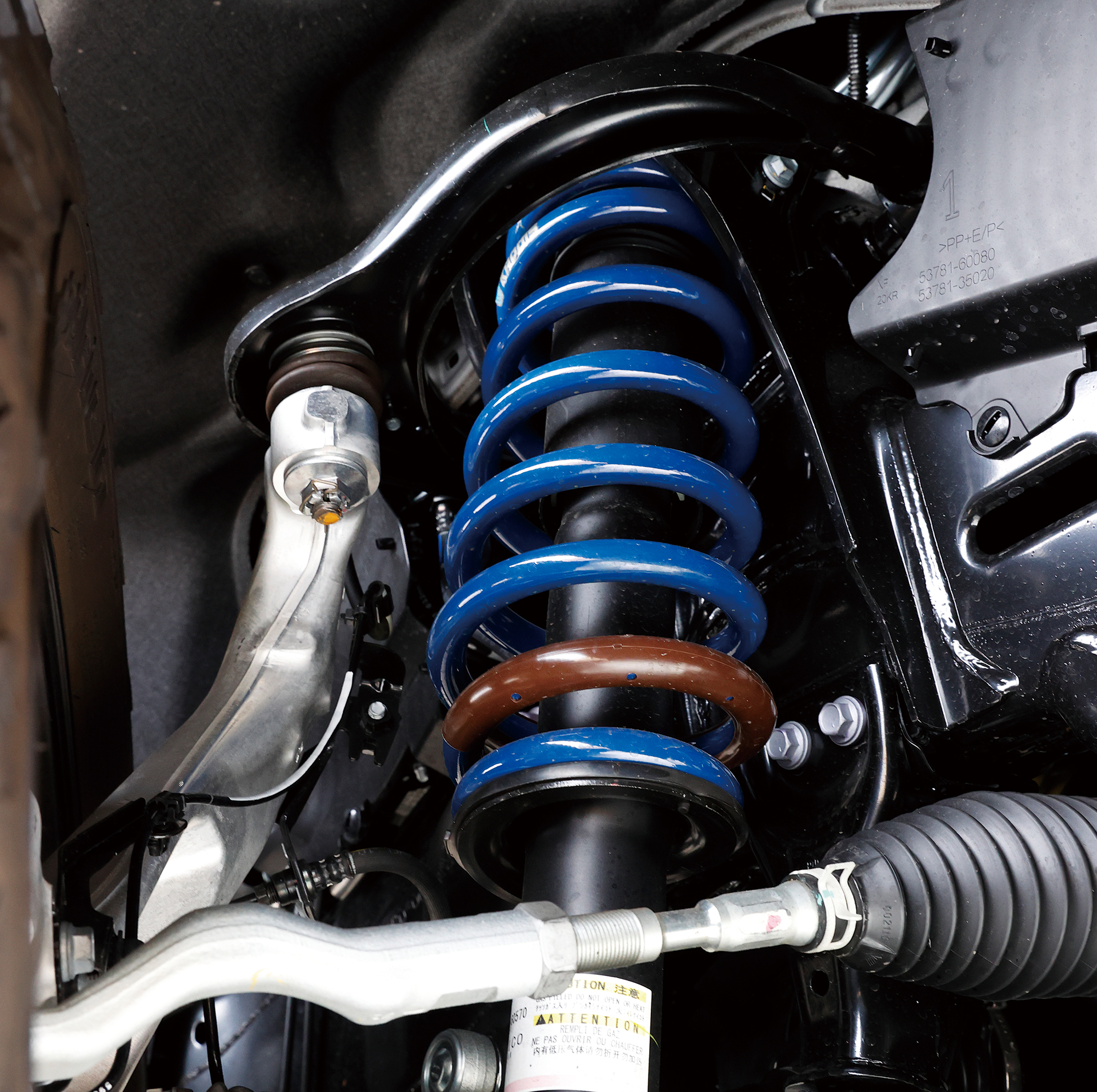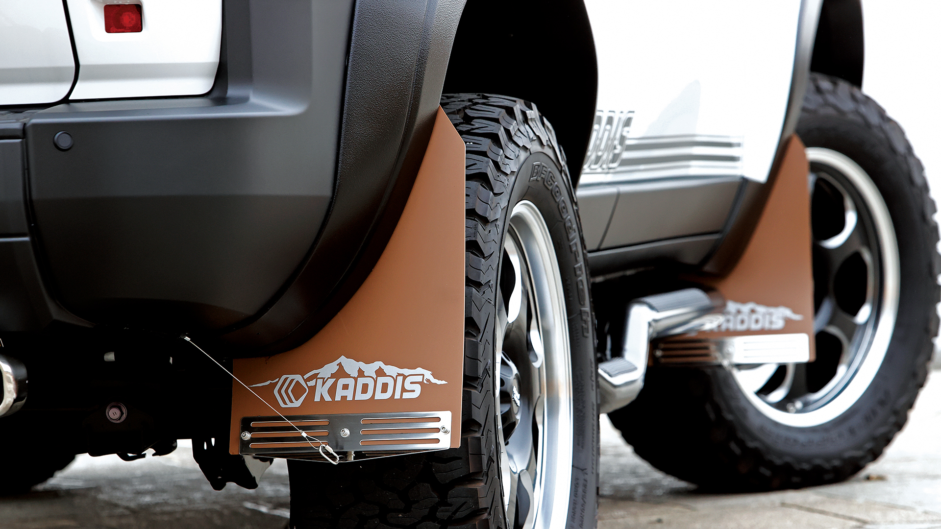 フロント40㎜、リア35㎜ワイドのオーバーフェンダーを装着。フェンダーの端部を純正のように処理することで、アフターパーツ感を払拭。リフトアップ&ワイド化により、タイヤサイズは285/60R20として、ホイールは軽さと強度を追求したブラッドストック・スーパーライトを組み合わせる。マッドフラップは差し色的な効果を意識し、シックなブラウンをチョイス。ワイパー付け根に、バグガード機能が期待できるウインドウディフレクターを装備。アップコイルの装着で約2インチリフトアップ。さらにスタビライザーのリンクやショック延長ブラケットも追加。ラテラルロッドの付け根には、偏心カムを備えたダウンブラケットを追加し、リフトアップでズレたホーシングの位置を元に戻し、ノーマル同等の挙動を実現。