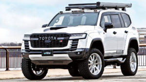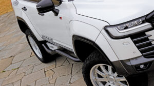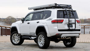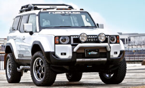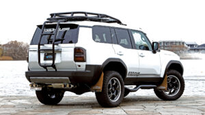 日本が世界に誇るランドクルーザーのフラッグシップモデル〝300〟。その威風堂々とした佇まいをさらに強調するため、独自の手法で大幅なリフトアップを行ない35インチタイヤに変更。もちろんそのままではタイヤがはみ出すため、ワイド化も実施。いわゆるオーバーフェンダーだけでワイドにするのではなく、ボディ全体を大きく見せるワイドボディキットを専用開発している所が注目点だ。さらに、ルーフキャリアやリヤラダーも専用開発。