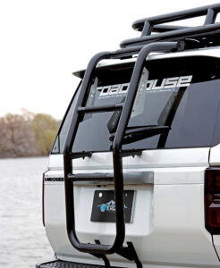 近年の4WDカスタムには欠かせない、ルーフキャリアとリアラダーを装着。また車高アップ時に必須のサイドステップは後席部分を低くすることで、子供の乗降にも配慮。いずれも実用性重視のアイテムだが、たくましさが感じられるように、太いパイプを採用。
