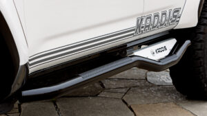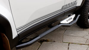 また後席部分の乗降性に配慮したサイドステップは、実用性とスタイルアップを両立してくれる。それだけにとどまらず、ルーフマーカーランプの追加やボンネット変更も加えることで、まさに〝エクストリーム300〟の名に相応しいスタイリングが完成した!