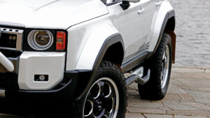 ノーマルフェンダーをそのままワイド化したような、ボディに調和するデザインのランクル300専用ワイドボディキット。自然な見た目だが、なんと片側60㎜幅で、ノーマルとは比較にならないほどワイド&立体感を主張できる。