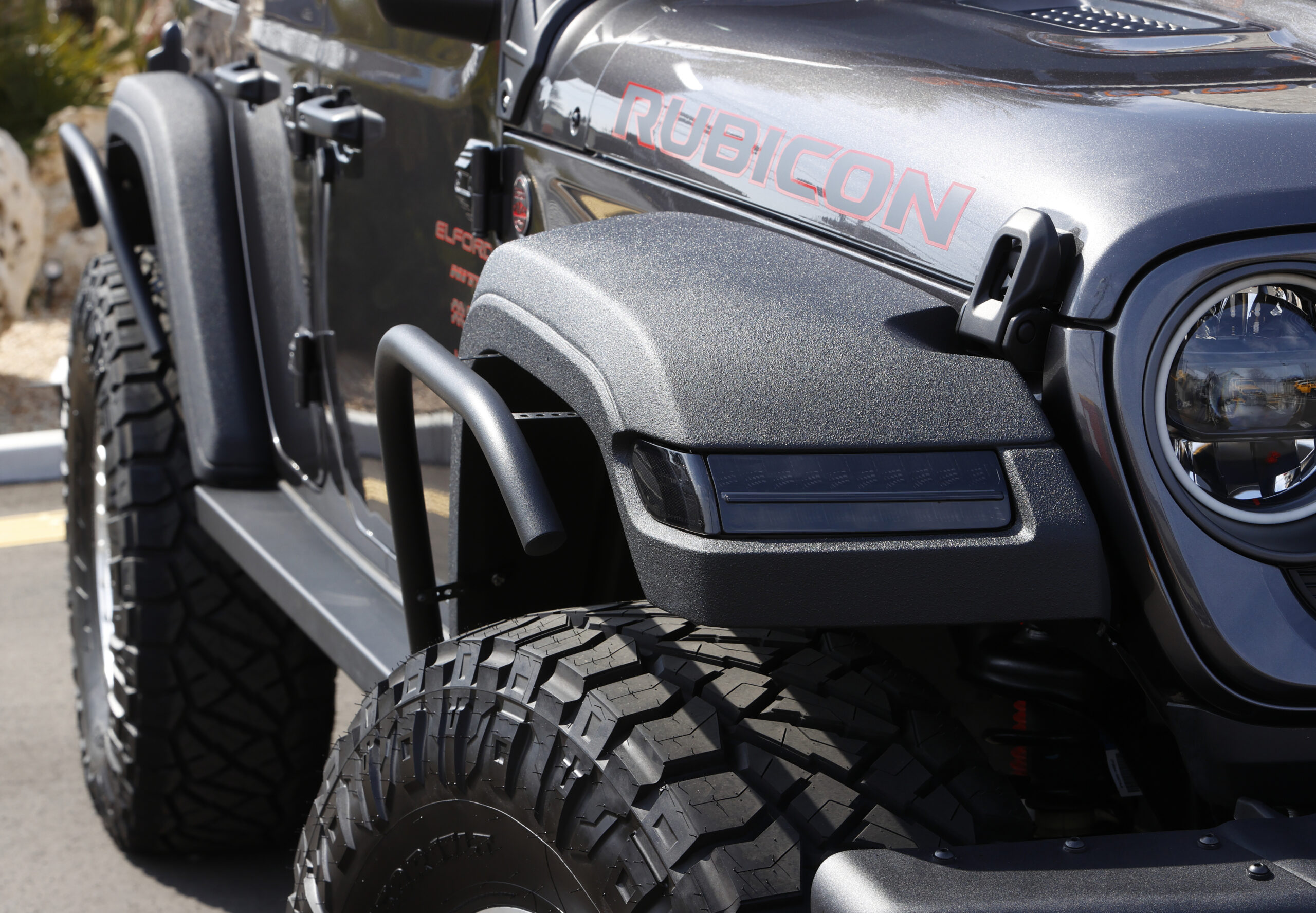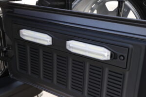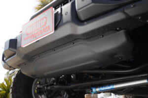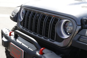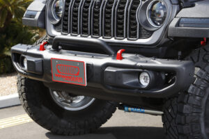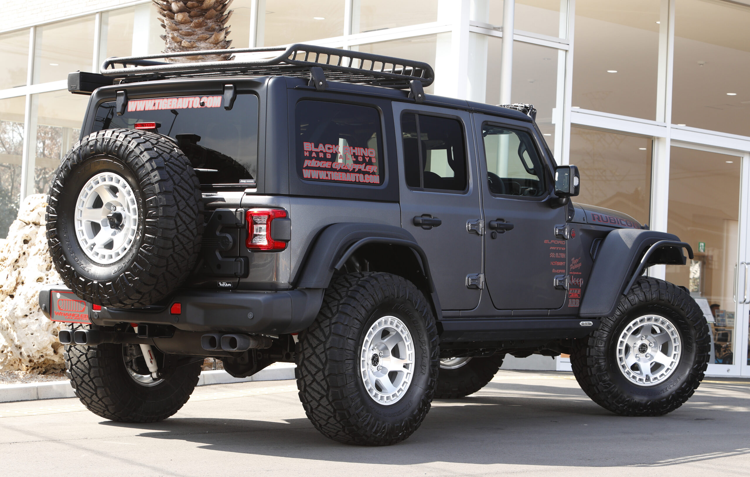 強度と軽さを両立した、アルミ製のフロントバンパーやスキッドプレートを新たに製作。リアバンパーも同様で、試作品を装着。またJL/JTに装着が可能なLEDヘッドライトリングもタイガーオート のオリジナルアイテムだ。