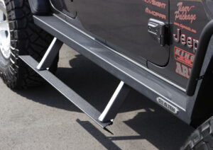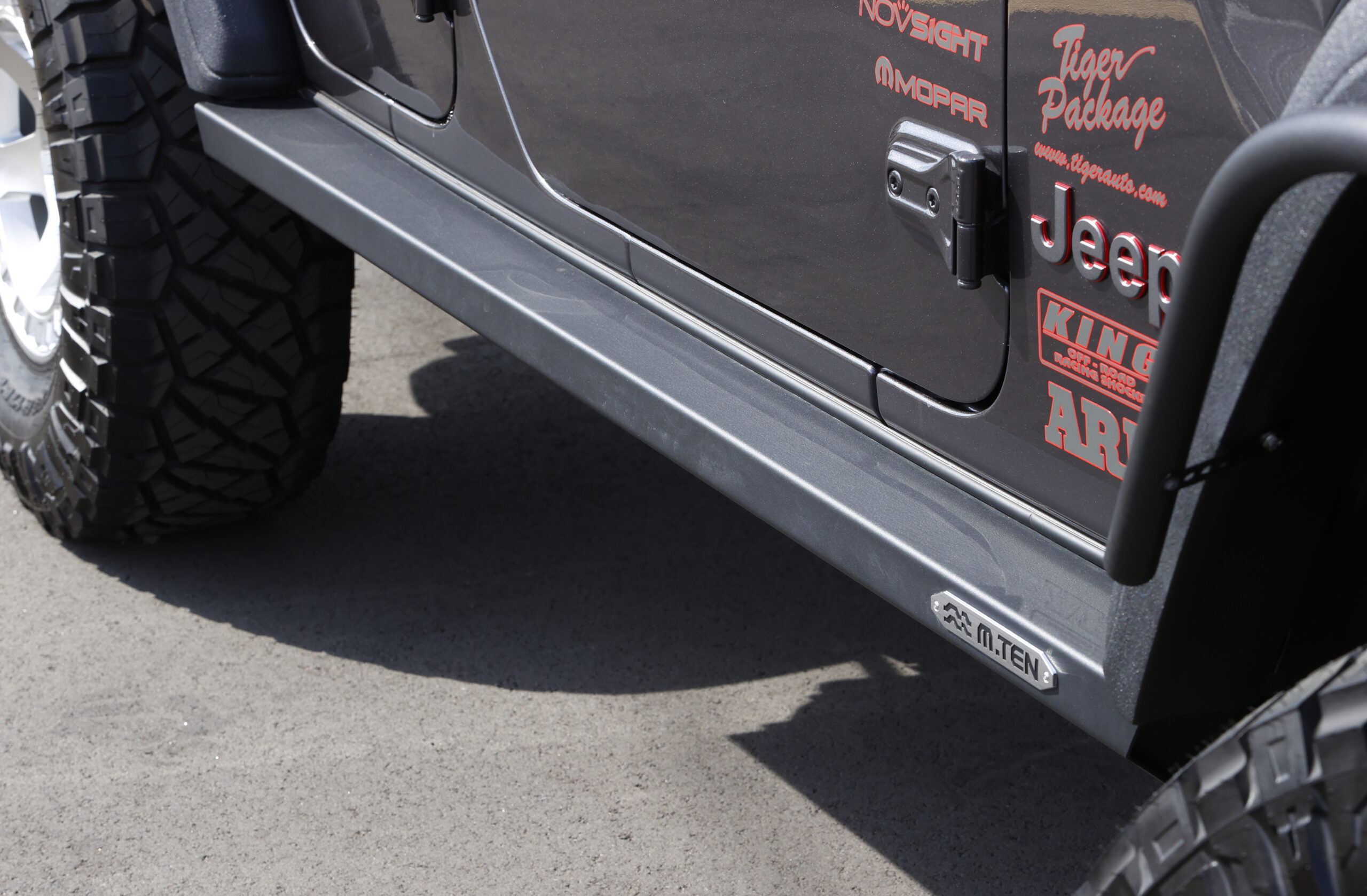 ドアの開閉に連動して作動する、M-TENの電動サイドステップ。サイドシルガードとしての強度も確保する。