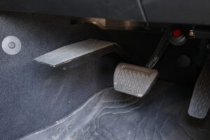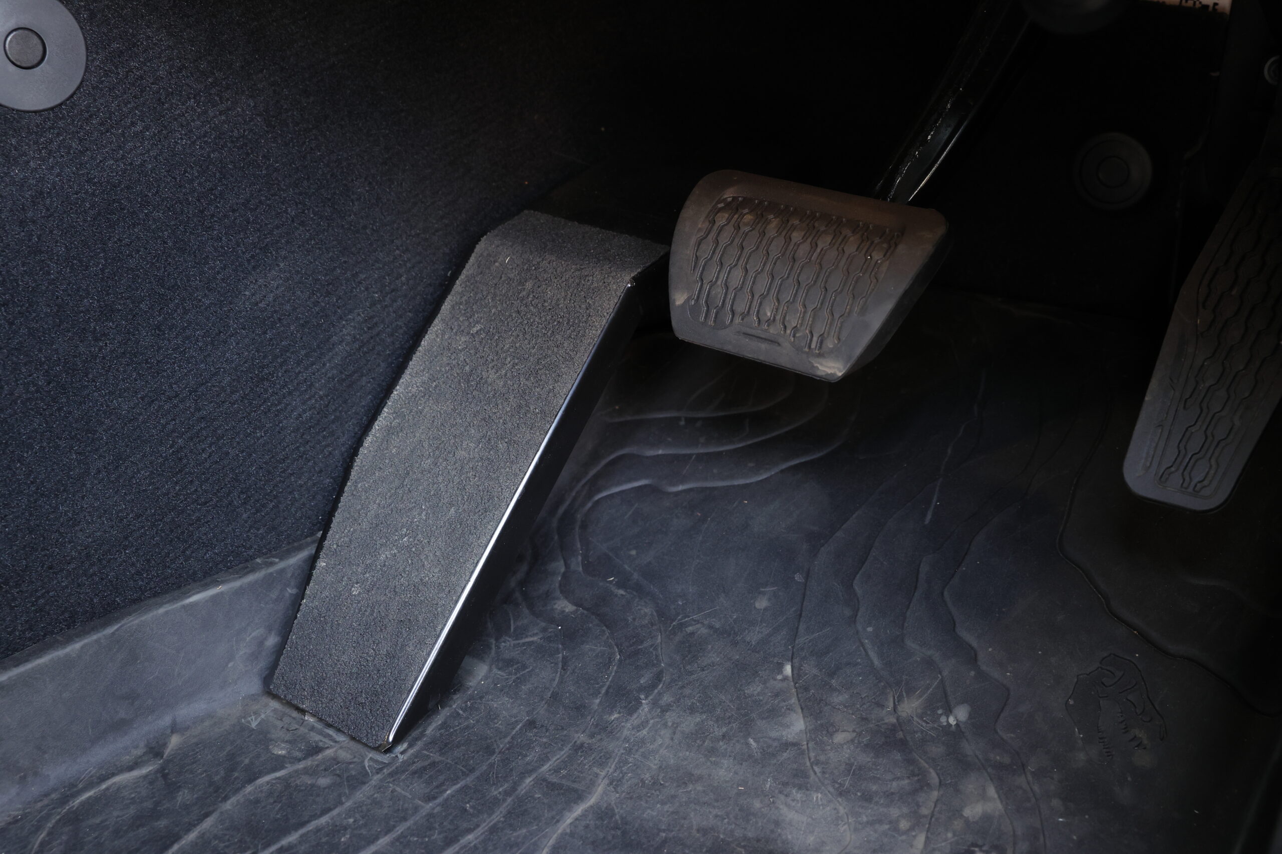 ロングドライブ時の疲労軽減につながる大型のフットレストもタイガーオートのオリジナル。跳ね上げ可能なので、車内の掃除も容易だ。