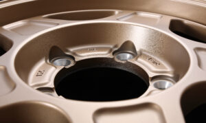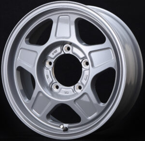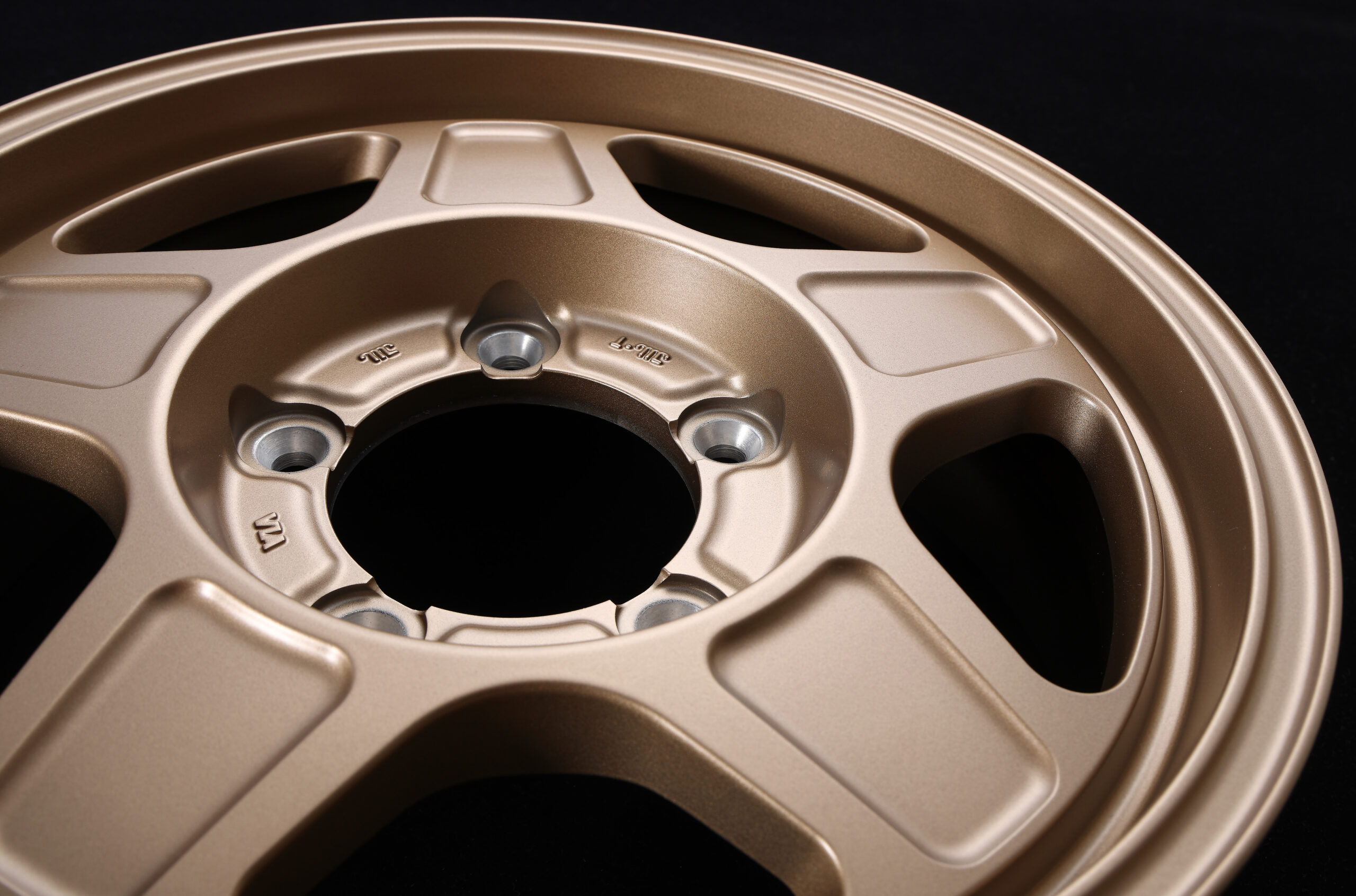 もちろん、カラーが際立つのはGWDのフォルムあってこそ。極太の5本スポークに大型ディンプルを施し、センター部を豪快にくり抜くように落とし込んで、オフロード感を強調。さらにリムフランジには溝を描きつつ、力強くディープなリムを確保し、パワー感を全面に押し出している。シンプルな星形5本スポークのフォルムと装着ターゲットを絞ったサイズ限定のレトロカラーによって、ジムニーJB64の雰囲気を大きく変えてくれる。