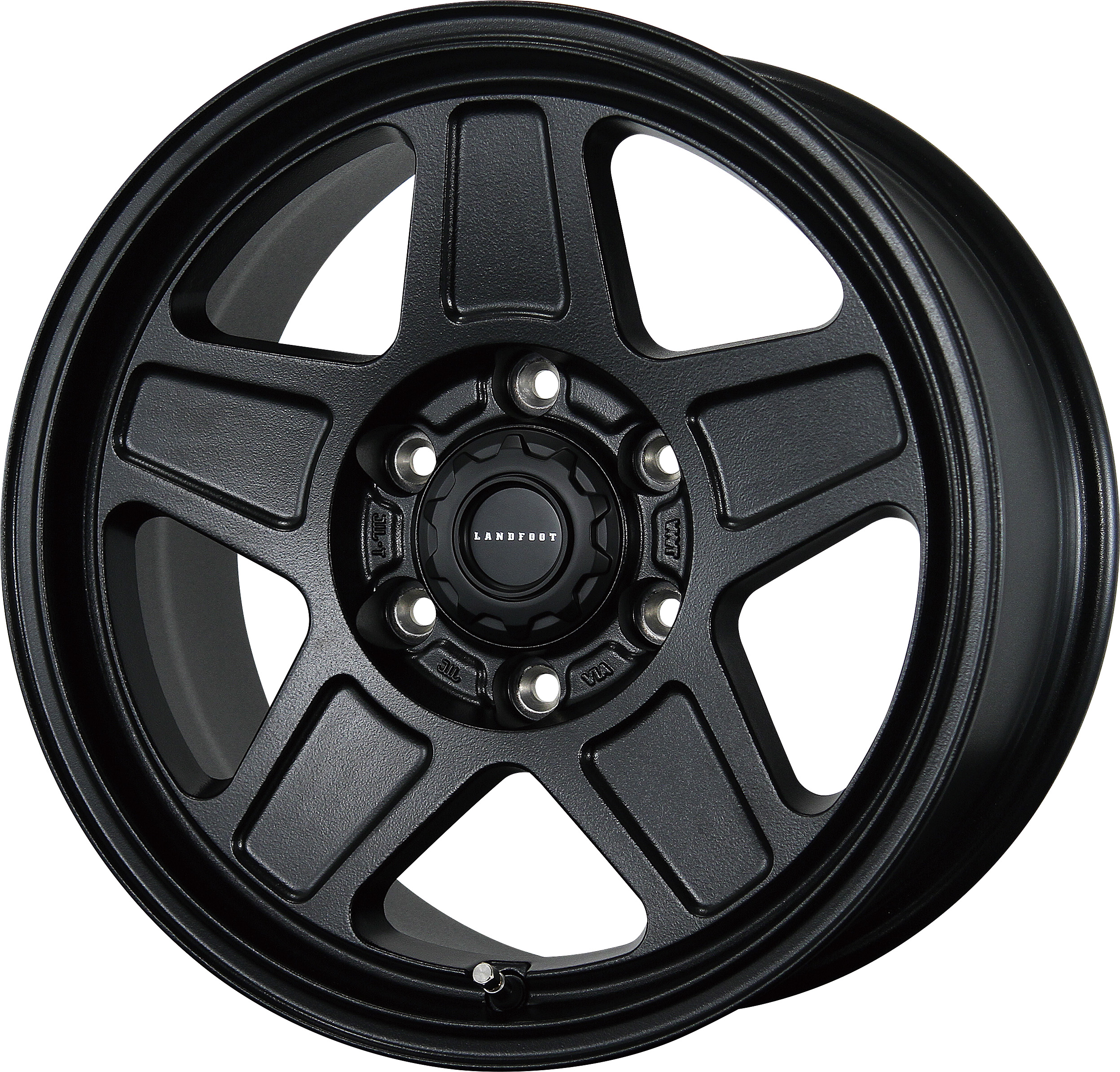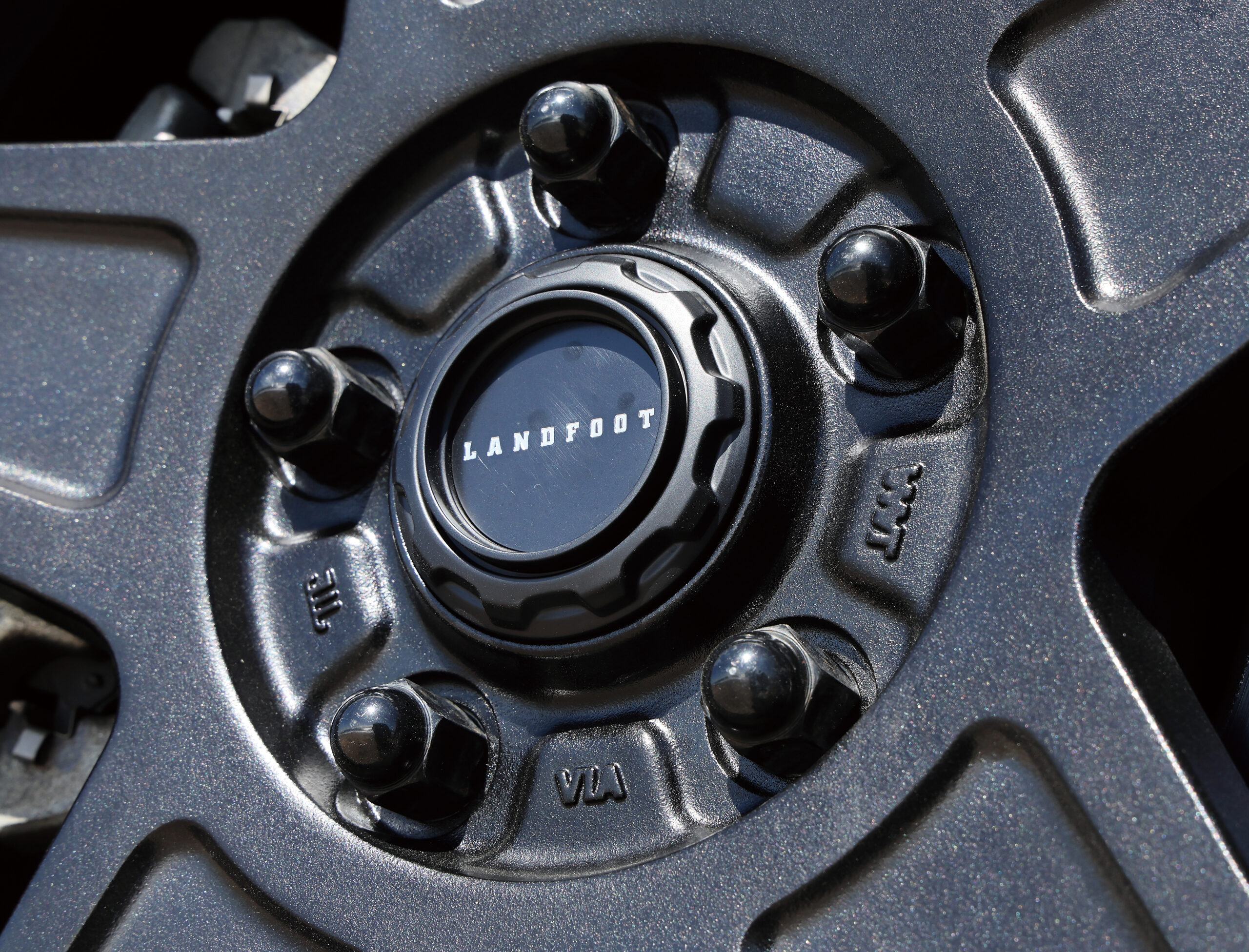 レトロな中にワイルドさを加えたラギッドな5本スポークデザインを持つランドフットGWD。各部のディテールにもこだわり、リムとデザイン面のつなぎ目には溝を設けてあるほか、さらにセンターを大きく穿つことで立体感も演出。なお、今回メインで紹介してるジムニー用にはセンターキャップは付属しないが、他サイズにはセンターキャップが設定される。