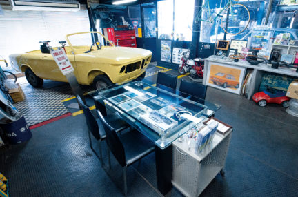県道265号線沿いに、華やかな輸入車が表に並ぶショールームがある。中を覗くと空冷ポルシェやオールドメルセデスなど、輸入車ファンなら思わず足を止めて眺めてしまうモデルがディスプレイされている。このショールームこそが、輸入車の新車、中古車販売店「アウトバーンモーター」だ。と言っても、販売業は同社の業務のひとつ。ショールームの裏へ足を運ぶと、もうひとつの顔である修理工場が見えてくる。リフト4基を備えるメインの工場に加え、車検用の施設、オーバーホールなどを手掛ける重整備用の建物、そして工具やパーツをストックする倉庫。中古車販売店のバックヤードとは思えない並々ならぬ陣容だ。
