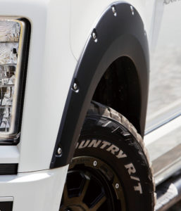 ジムニーシエラJB74には、サイドシルプロテクターやフェンダープロテクター(素材はともにカーボン調PVC材)を採用。つまり泥ハネや飛び石からしっかりとボディを守ってくれる。