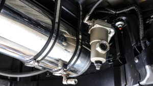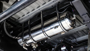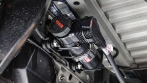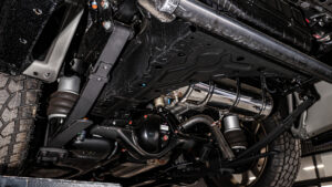 10インチのストロークを誇る、KUHLとエアフォースが共同開発したエアサスに交換。フロントのバンプストッパーは可能な限り薄い物に変更。リアのシャックルやリーフはノーマルのままだが、ホーシングとリーフの位置を逆にするアンダースラングや、3インチのダウンブロックも装着。コンプレッサーは1機搭載するが、最大2機装着可能。エアタンクには水抜きのドレンや、水分除去フィルターも装備する。またKUHLでは年に1度タンクの水抜きと電磁弁の清掃を行なうメンテナンスプランも用意している。なお写真は試作品で、エアバッグの形状が製品版では変更される予定だ。