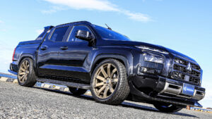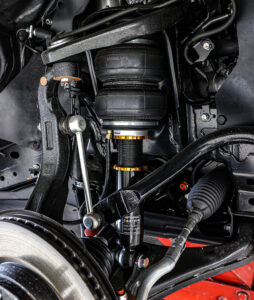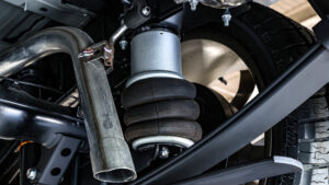 ボディ各部にエアロパーツを追加し、より低く見えるスタイルにアレンジするが、やはりサスペンションチューニングは不可欠。そこでKUHLでは足回りをエアフォースと共同開発したエアサスに変更。シャックルとリーフはノーマルのままで、ホーシングとリーフの位置を逆にするアンダースラング化を実施。この状態で約4インチダウンだが構造変更は不要だ。