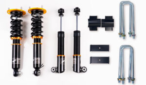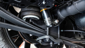エアサスよりも手軽にローダウンが楽しめるように、KUHLでは車高調キットも開発中。リアのリーフやシャックルはそのままでも、アンダースラングと併用すれば、4インチダウンが実現可能。減衰力の調整機構も備わる予定なので、ローダウンを行ないながらも快適な乗り味もしっかり追求する。